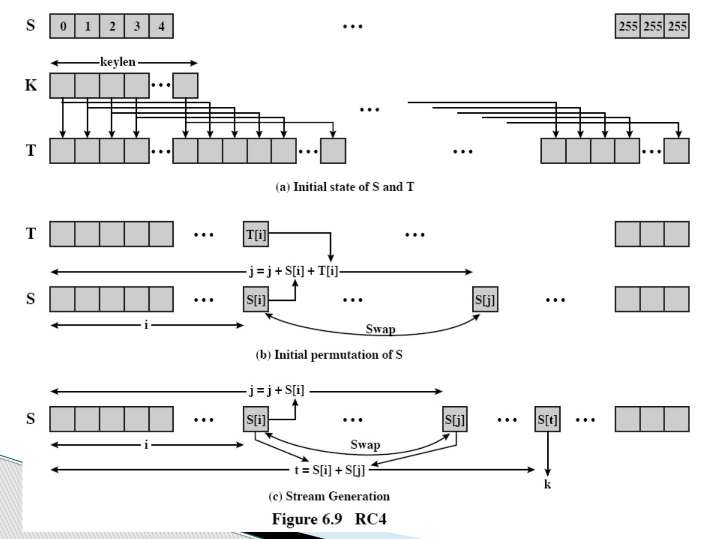 29 .RC4 密钥安排 从数组 S 开始, S 为 {0..255} 使用密钥充分进行变换 S 形成密码的内在状态 internal state 密钥 k 的长度为 l 字节 for i = 0 to 255 do S[ i ] = i j = 0 for i = 0 to 255 do j = (j + S[ i ] + k[ i mod l]) (mod 256) swap (S[ i ], S[j])