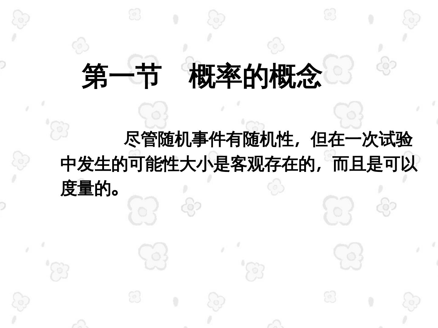 3 . 第一节 概率的概念 尽管随机事件有随机性,但在一次试验 中发生的可能性大小是客观存在的,而且是可以 度量的。