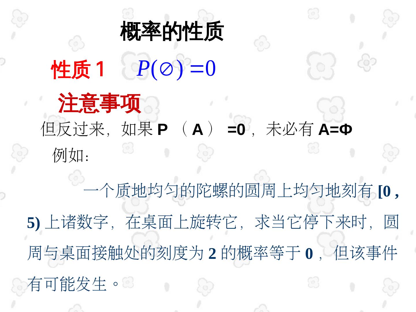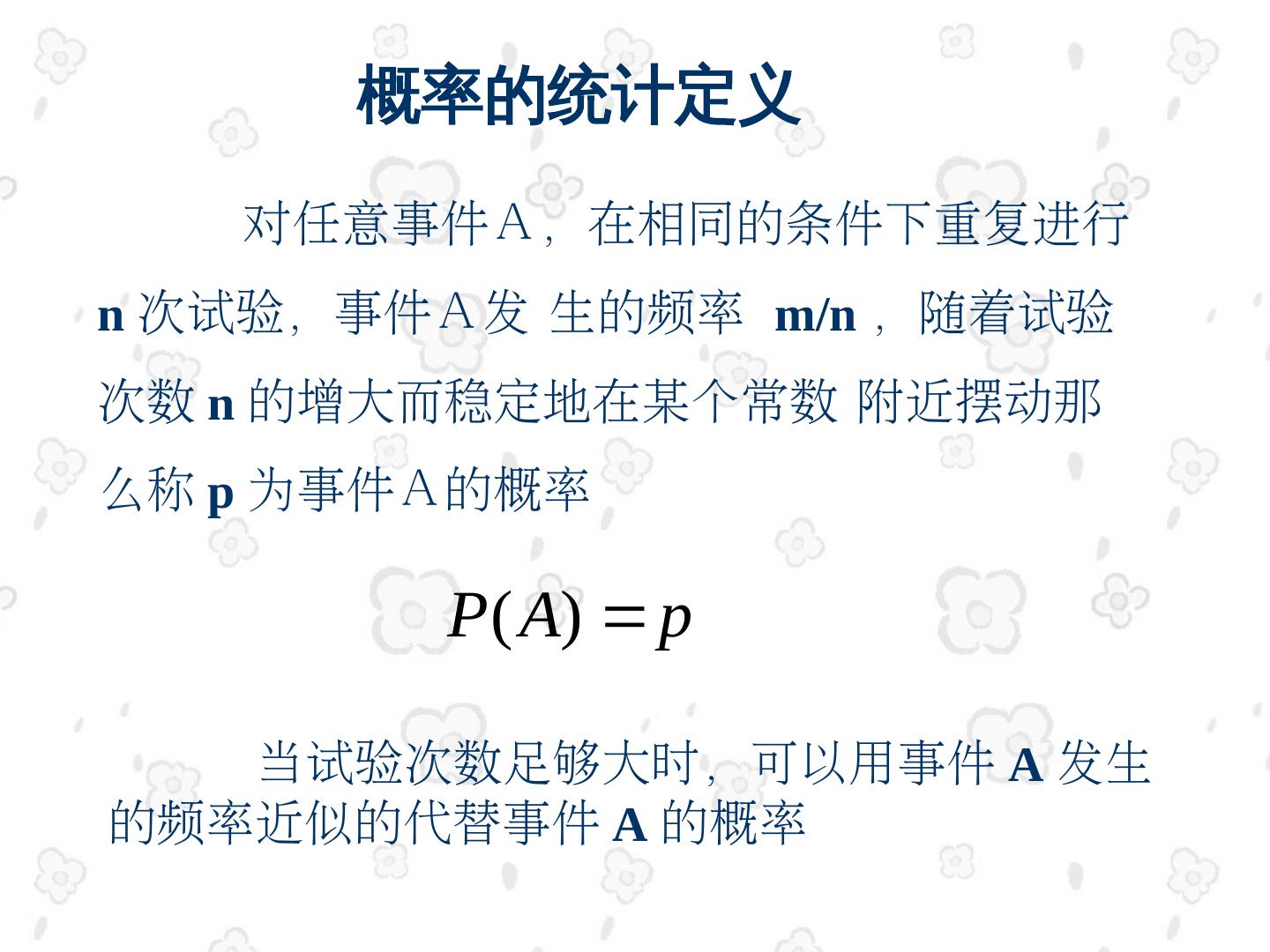 8 . 概率的统计定义 对任意事件A出现的次数A发生可能性大小,可以规定,在相同的条件A出现的次数下重复进行 n 次试验,事件A出现的次数A发生可能性大小,可以规定发 生的频率 m/n ,随着试验 次数 n 的增大而稳定地在某个常数 附近摆动那 么称 p 为事件A出现的次数A发生可能性大小,可以规定的概率 P ( A) p 当试验次数足够大时,可以用事件A出现的次数 A 发生 的频率近似的代替事件A出现的次数 A 的概率