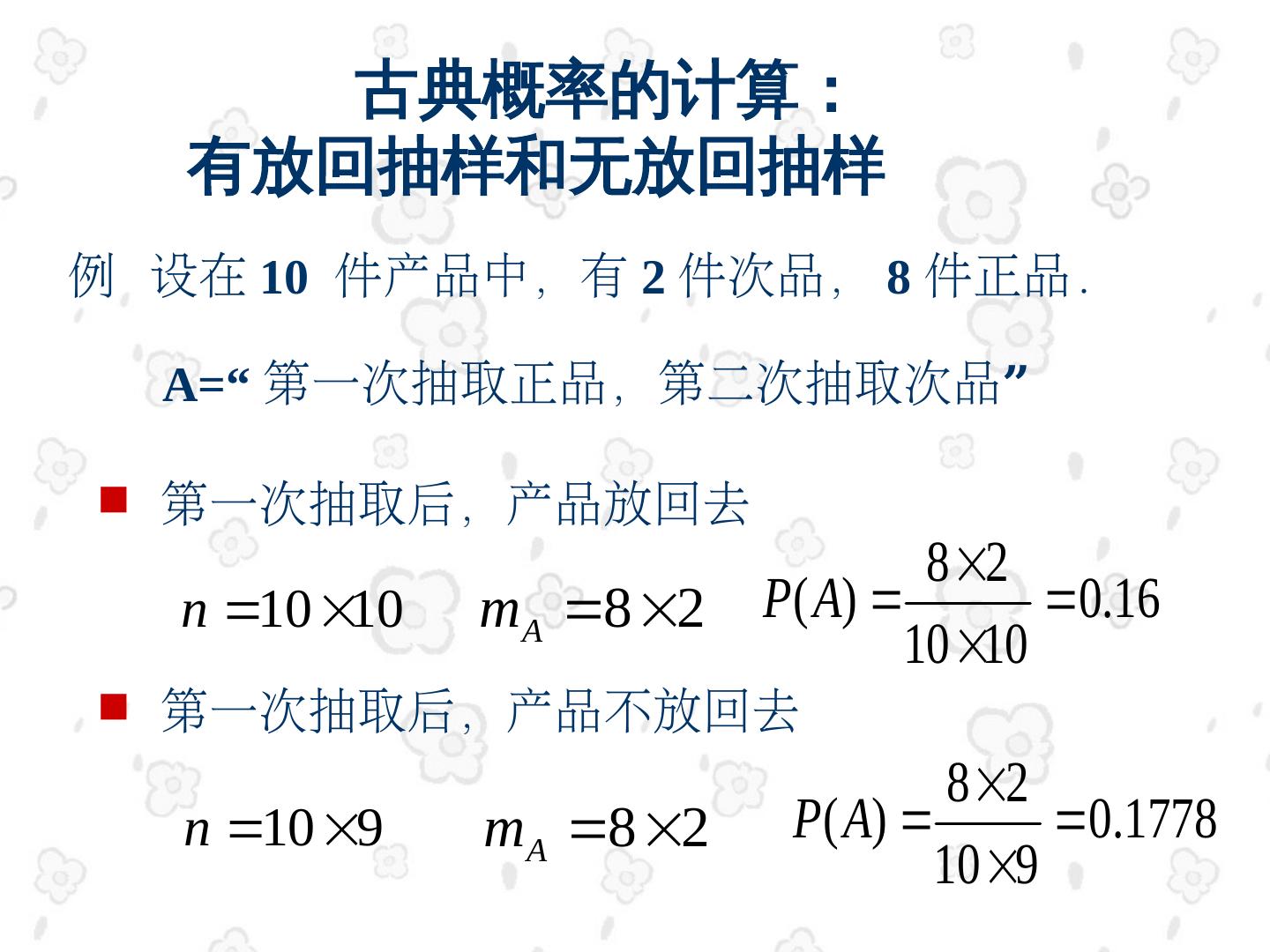 15 . 古典概率的计算: 有放回抽样和无放回抽样 例 设在 10 件A出现的次数产品中,有 2 件A出现的次数次品, 8 件A出现的次数正品. A=“ 第一次抽取正品,第二次抽取次品” 第一次抽取后,产品放回去 8 2 n 10 10 mA 8 2 P( A) 0.16 10 10 第一次抽取后,产品不放回去 8 2 n 10 9 mA 8 2 P( A) 0.1778 10 9