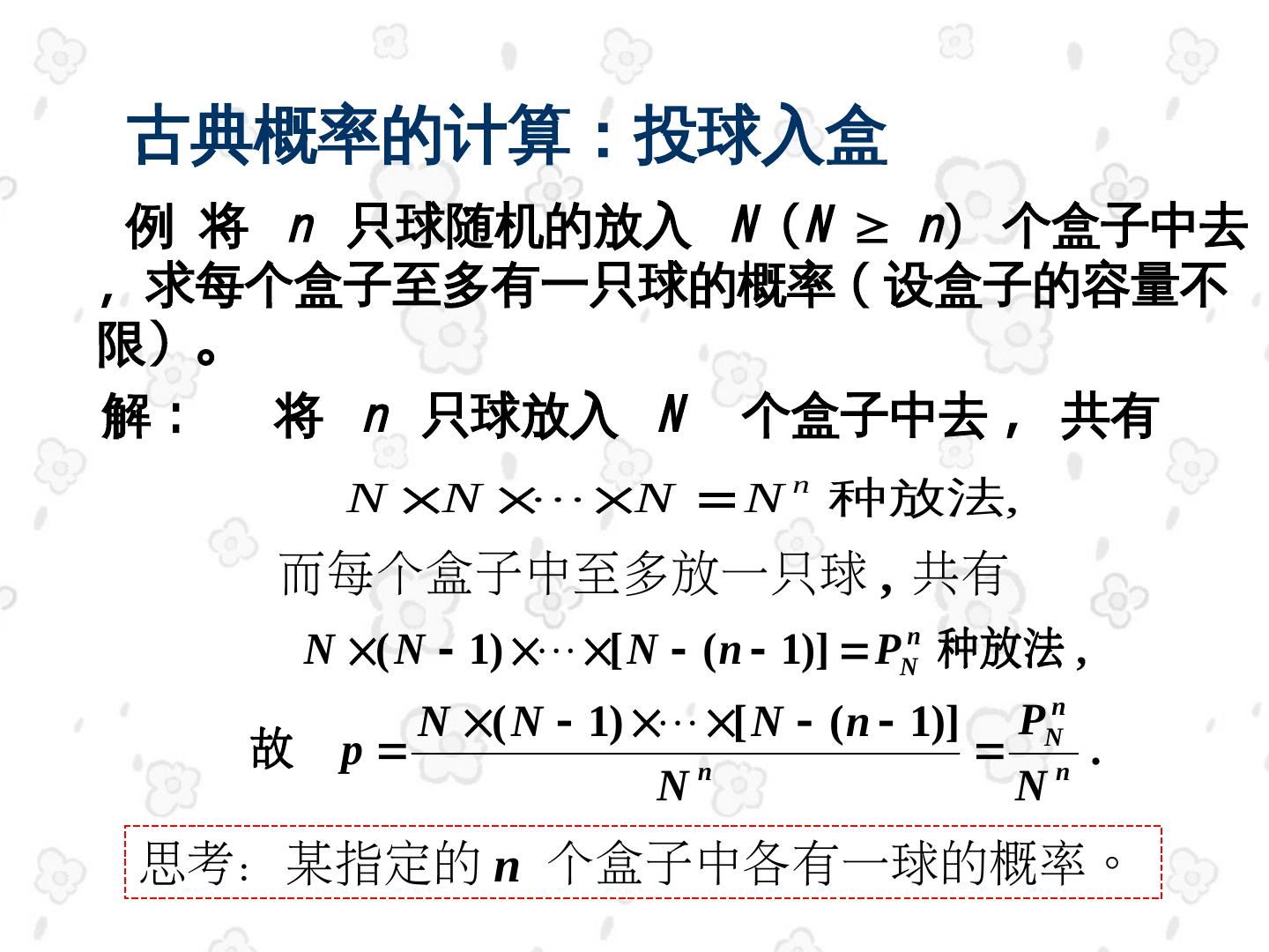 16 .古典概率的计算:投球入盒 例 将 n 只球随机的放入 N (N n) 个盒子中去 ,求每个盒子至多有一只球的概率 ( 设盒子的容量不 限)。 解: 将 n 只球放入 N 个盒子中去 , 共有 N N N N n 种放法, 而每个盒子中至多放一只球 , 共有 N ( N 1) [ N ( n 1)] PNn 种放法 , N ( N 1) [ N ( n 1)] PNn 故 p n n . N N 思考:某指定的 n 个盒子中各有一球的概率。
