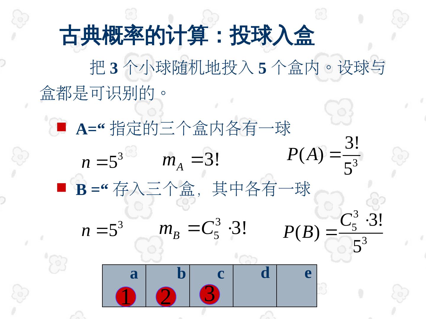 17 . 古典概率的计算:投球入盒 把 3 个小球随机地投入 5 个盒内。设球与 盒都是可识别的。 A=“ 指定的三个盒内各有一球 3! n 53 mA 3! P ( A) 3 5 B =“ 存入三个盒,其中各有一球 3 mB C 3! C53 3! n 53 5 P( B) 3 5 a b c d e 1 2 3
