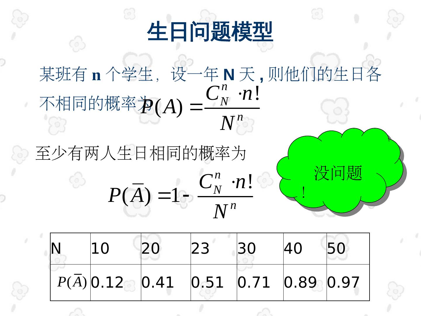 19 . 生日问题模型 某班有 n 个学生,设一年 N 天 , 则 他们的生日各 n C n ! P ( A) 不相同的概率为 n N N 至少有两人 生日相同的概率为 n 没问题 可能吗 可能吗 没问题 C n ! P( A) 1 n N ? ! ? ! N N 10 20 23 30 40 50 P( A) 0.12 0.41 0.51 0.71 0.89 0.97