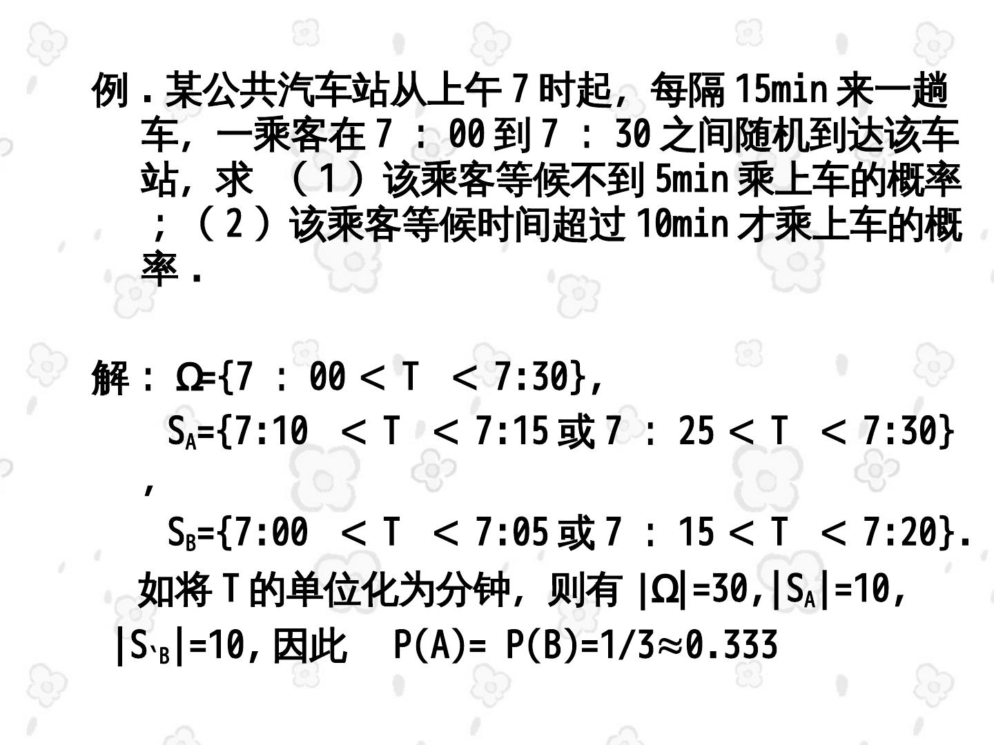 27 .例 . 某公共汽车站从上午 7 时起,每隔 15minmin 来一趟 车,一乘客在 7 : 00 到 7 : 30 之间随机到达该车 站,求 ( 1 )该乘客等候不到 5minmin 乘上车的概率 ;( 2 )该乘客等候时间超过 10min 才乘上车的概 率. 解: Ω={7 : 00 < T < 7:30}, SA={7:10 < T < 7:15min 或 7 : 25min < T < 7:30} , SB={7:00 < T < 7:05min 或 7 : 15min < T < 7:20}. 如将 T 的单位化为分钟,则有 |Ω|=30,|SA|=10, |S`B|=10, 因此 P(A)= P(B)=1/3≈0.333