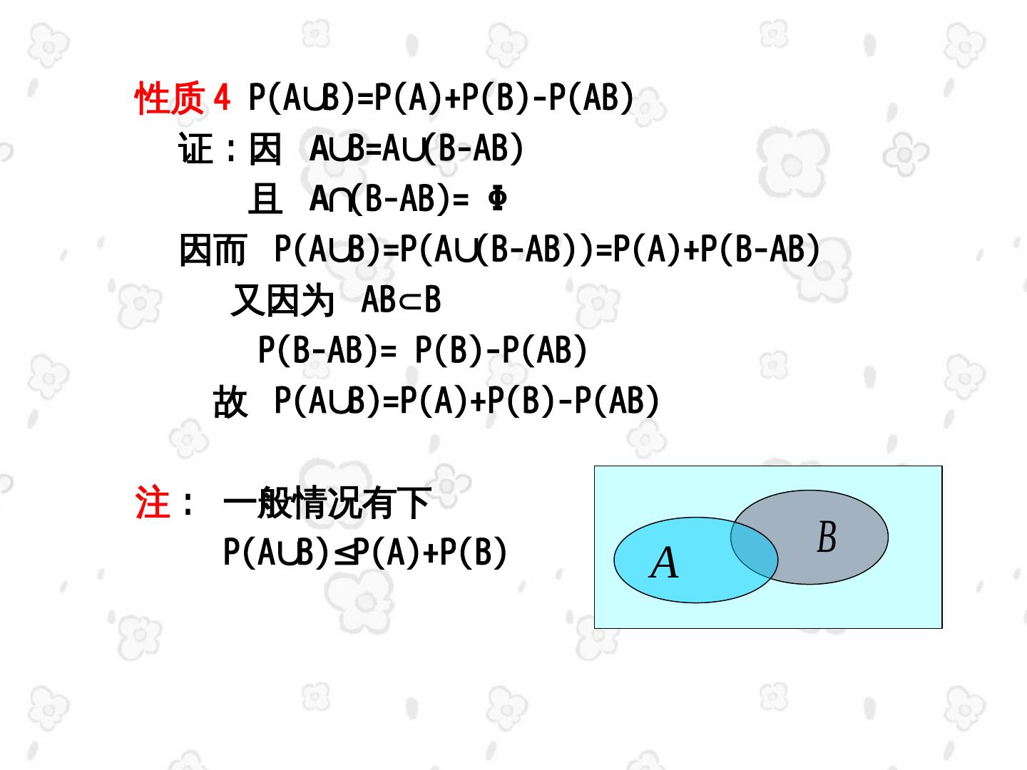 10 . 概率的统计定义 m 频率 f n ( A) 稳定于概率 p P ( A) n 性质: ( 1 ) 0 p 1 ( 2 ) P () 1, P ( ) 0 (3) 若 A , B 互斥,则 P ( A B ) P ( A) P ( B ) 若 A1 , A2 , A3… , An 互斥,则 n n P(A k ) P(A k ) k 1 k 1