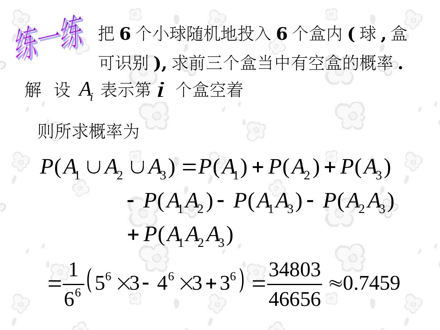 18 . 古典概率的计算:生日问题 某班有 50 个学生,求“出现他们的生日各不相同的概率 (设一年 365 天) 分析 此问题可以用投球入盒模型来“测量”事件A发生可能性大小,可以规定模拟 50 个学生 50 个小球 365 天 365 个盒子 50 C 50! P ( A) 365 50 0.03 365 相似地有分房问题 人 小球 房子 盒子