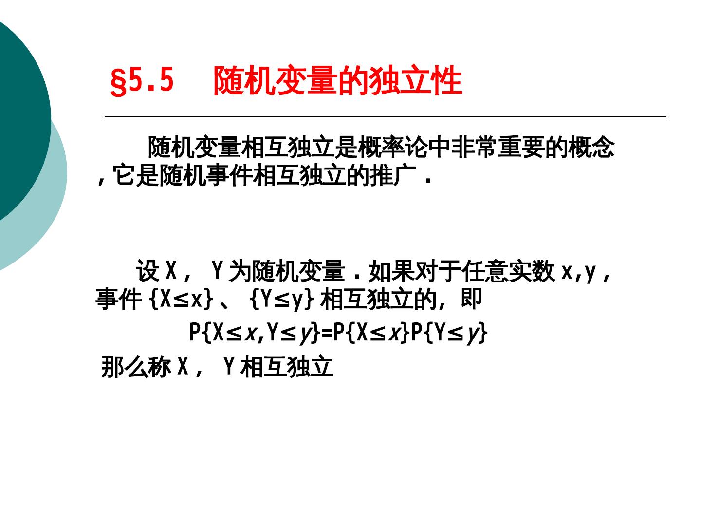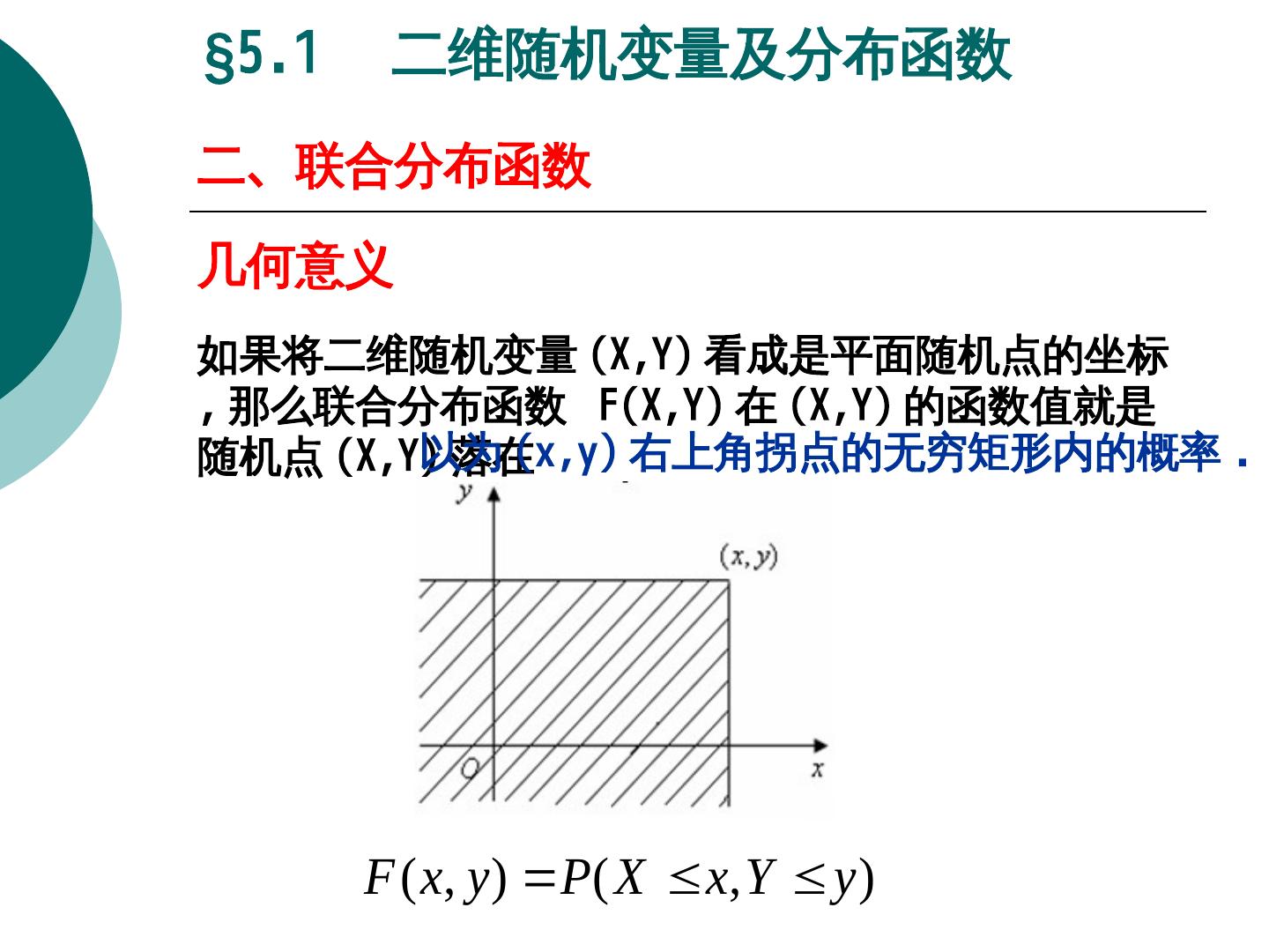 4 .§5.1 二维随机变量及分布函数 二、联合分布函数 几何意义 如果将二维随机变量 (X,Y)X,Y) 看成是平面随机点的坐标 , 那么联合分布函数 F(X,Y)X,Y) 在 (X,Y)X,Y) 的函数值就是 以为 随机点 (X,Y)X,Y) (X,Y)x,y) 右上角拐点的无穷矩形内的概率 . 落在 F ( x , y ) P ( X x, Y y )