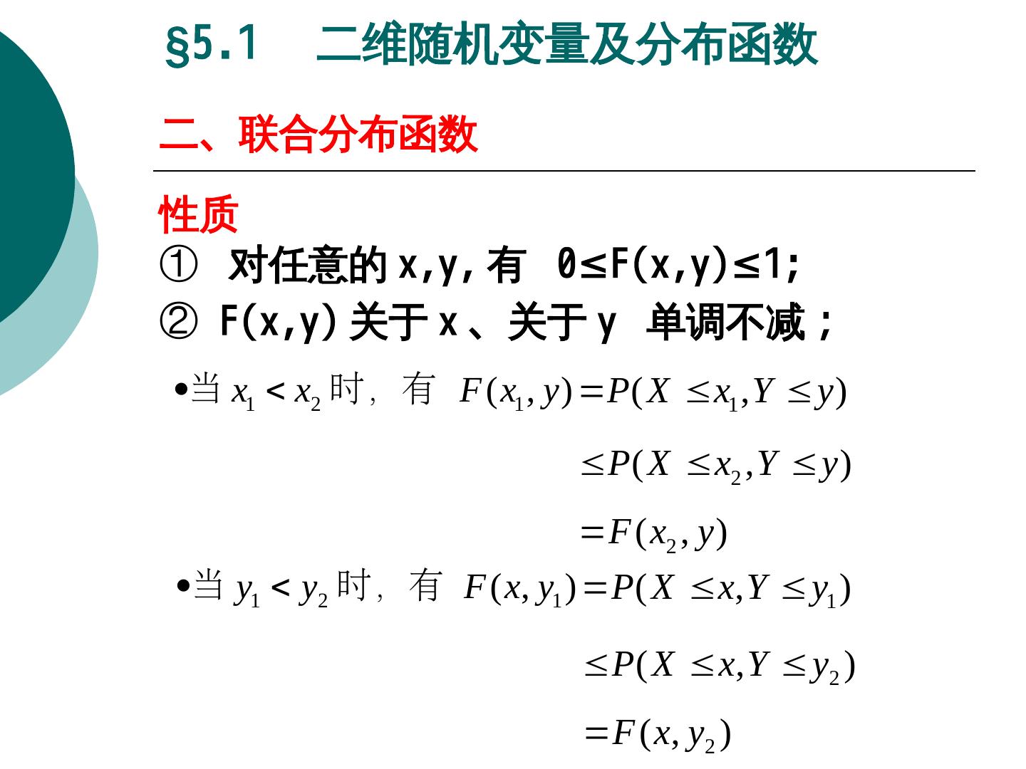 5 .§5.1 二维随机变量及分布函数 二、联合分布函数 性质 ① 对任意的 x,y, 有 0≤F(X,Y)x,y)≤1; ② F(X,Y)x,y) 关于 x 、关于 y 单调不减; 当 x1 x2 时,有 F ( x1 , y ) P( X x1 , Y y ) P ( X x2 , Y y ) F ( x2 , y ) 当 y1 y2 时,有 F ( x, y1 ) P( X x, Y y1 ) P ( X x, Y y2 ) F ( x, y2 )
