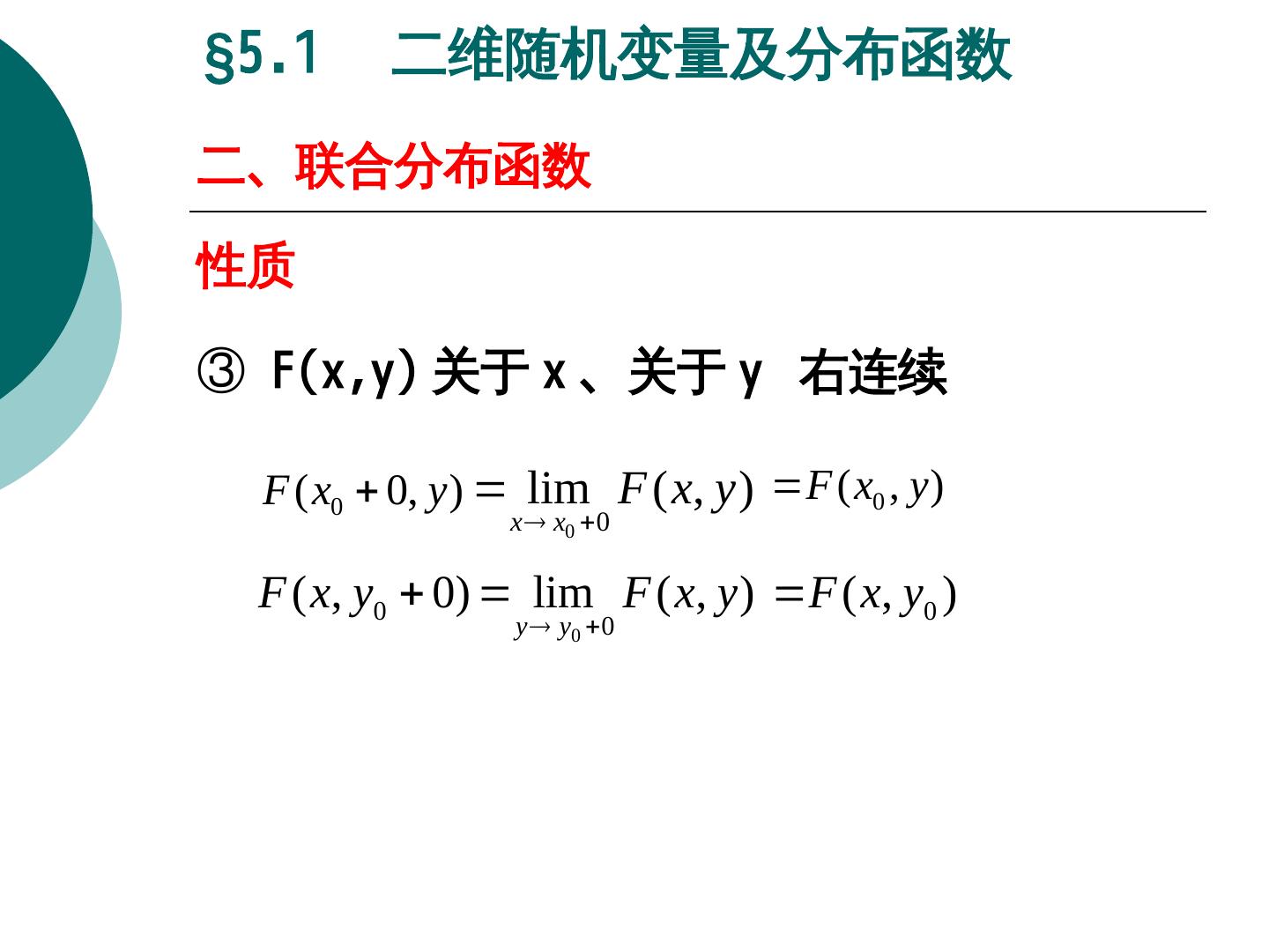 6 .§5.1 二维随机变量及分布函数 二、联合分布函数 性质 ③ F(X,Y)x,y) 关于 x 、关于 y 右连续 F ( x0 0, y ) lim F ( x, y ) F ( x0 , y ) x x0 0 F ( x, y0 0) lim F ( x, y ) F ( x, y0 ) y y0 0