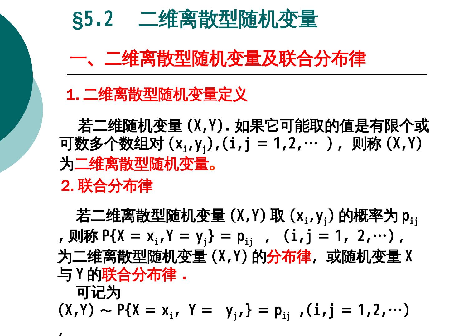 11 . §5.2 二维离散型随机变量 一、二维离散型随机变量及联合分布律 1. 二维离散型随机变量定义 若二维随机变量 (X,Y)X,Y). 如果它可能取的值是有限个或 可数多个数组对 (X,Y)xi,yj),(X,Y)i,j = 1,2,… ) ,则称 (X,Y)X,Y) 为二维离散型随机变量。 2. 联合分布律 若二维离散型随机变量 (X,Y)X,Y) 取 (X,Y)xi,yj) 的概率为 pij , 则称 P{X = xi,Y = yj} = pij , (X,Y)i,j = 1, 2,…) , 为二维离散型随机变量 (X,Y)X,Y) 的分布律,或随机变量 X 与 Y 的联合分布律 . 可记为 (X,Y)X,Y) ~ P{X = xi, Y = yj,} = pij ,(X,Y)i,j = 1,2,…) ,