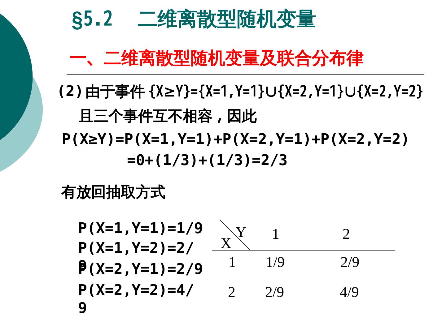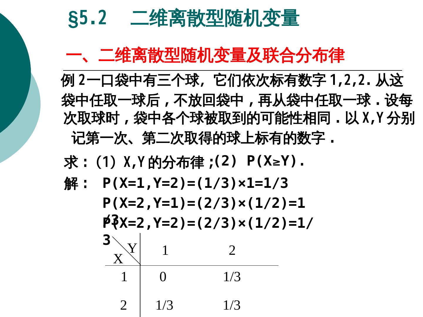 13 .§5.2 二维离散型随机变量 一、二维离散型随机变量及联合分布律 例 2一口袋中有三个球,它们依次标有数字 1,2,2. 从这 袋中任取一球后 , 不放回袋中 , 再从袋中任取一球 . 设每 次取球时 , 袋中各个球被取到的可能性相同 . 以 X,Y 分别 记第一次、第二次取得的球上标有的数字 . 求 : (X,Y)1) X,Y 的分布律 ;(2) P(X≥Y). 解 : P(X=1,Y=2)=(1/3)×1=1/3 P(X=2,Y=1)=(2/3)×(1/2)=1 /3 P(X=2,Y=2)=(2/3)×(1/2)=1/ 3 Y 1 2 X 1 0 1/3 2 1/3 1/3
