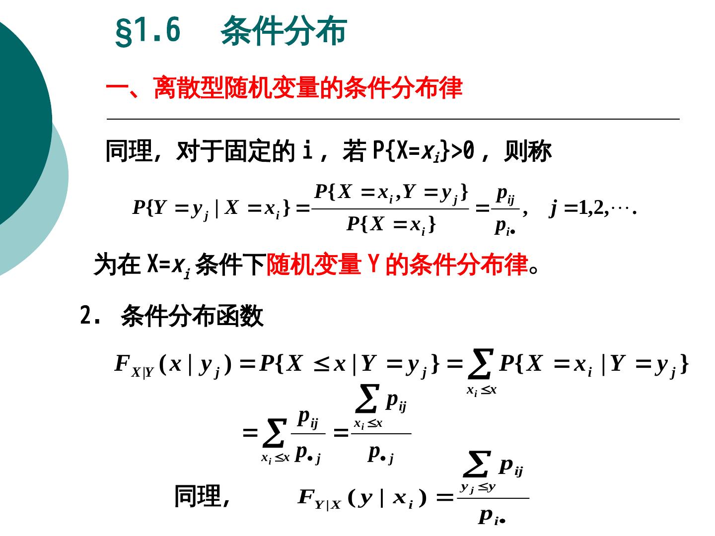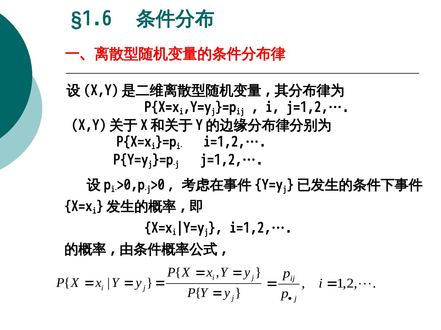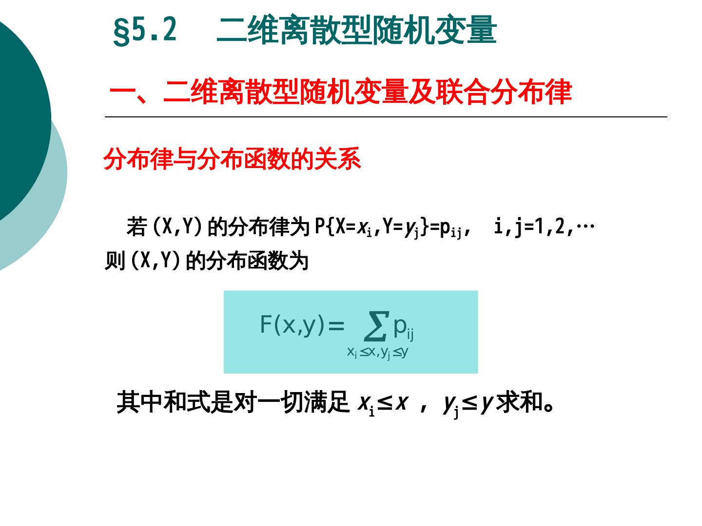 15 .§5.2 二维离散型随机变量 一、二维离散型随机变量及联合分布律 分布律与分布函数的关系 若 (X,Y)X,Y) 的分布律为 P{X=xi,Y=yj}=pij, i,j=1,2,… 则 (X,Y)X,Y) 的分布函数为 F(x,y) p xi x,yj y ij 其中和式是对一切满足 xi≤x , yj≤y 求和。