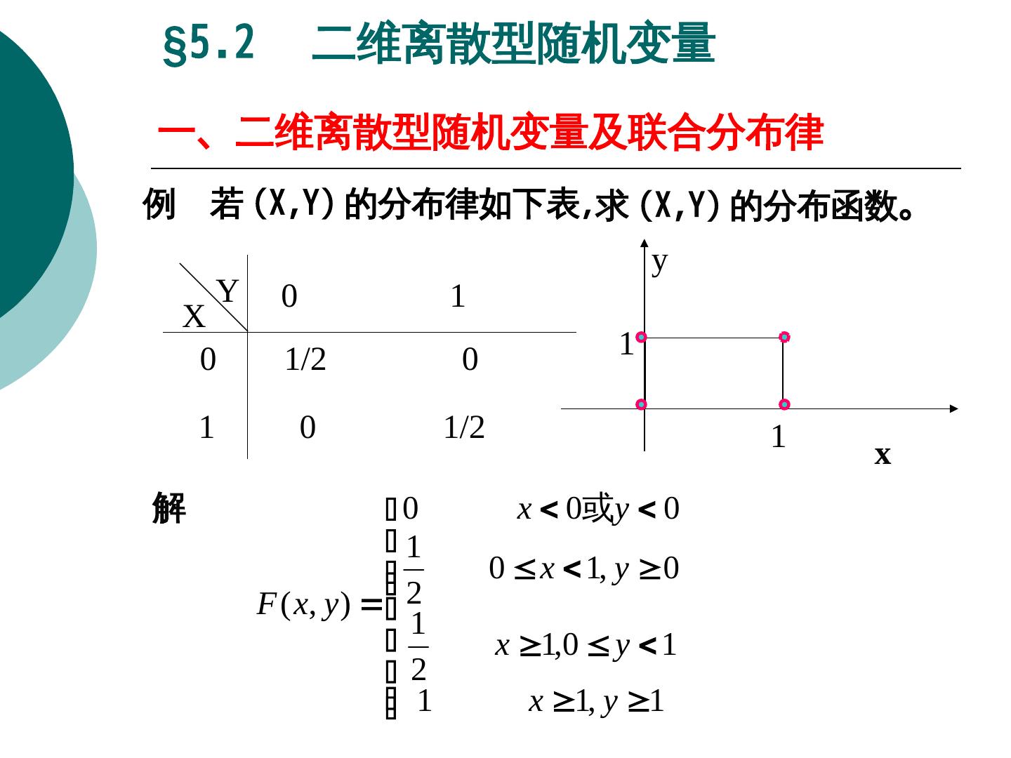 16 .§5.2 二维离散型随机变量 一、二维离散型随机变量及联合分布律 例 若 (X,Y)X,Y) 的分布律如下表, 求 (X,Y)X,Y) 的分布函数。 y Y 0 1 X 0 1/2 0 1 1 0 1/2 1 x 解 0 x 0或y 0 1 0 x 1, y 0 F ( x, y ) 2 1 x 1,0 y 1 2 1 x 1, y 1