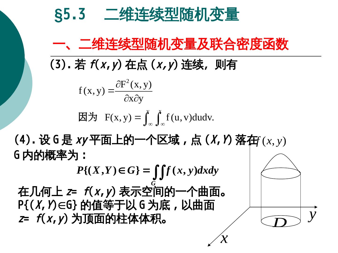 18 . §5.3 二维连续型随机变量 一、二维连续型随机变量及联合密度函数 (X,Y)3). 若 f(X,Y)x,y) 在点 (X,Y)x,y) 连续,则有 F2 ( x, y) f ( x , y) xy y x 因为 F( x, y) f (u, v)dudv. (X,Y)4). 设 G 是 xy 平面上的一个区域 , 点 (X,Y)X,Y) 落在f ( x, y ) G 内的概率为 : P{( X , Y ) G } f ( x , y )dxdy G 在几何上 z= f(X,Y)x,y) 表示空间的一个曲面。 P{(X,Y)X,Y)∈G} 的值等于以 G 为底 , 以曲面 z= f(X,Y)x,y) 为顶面的柱体体积。 y D x