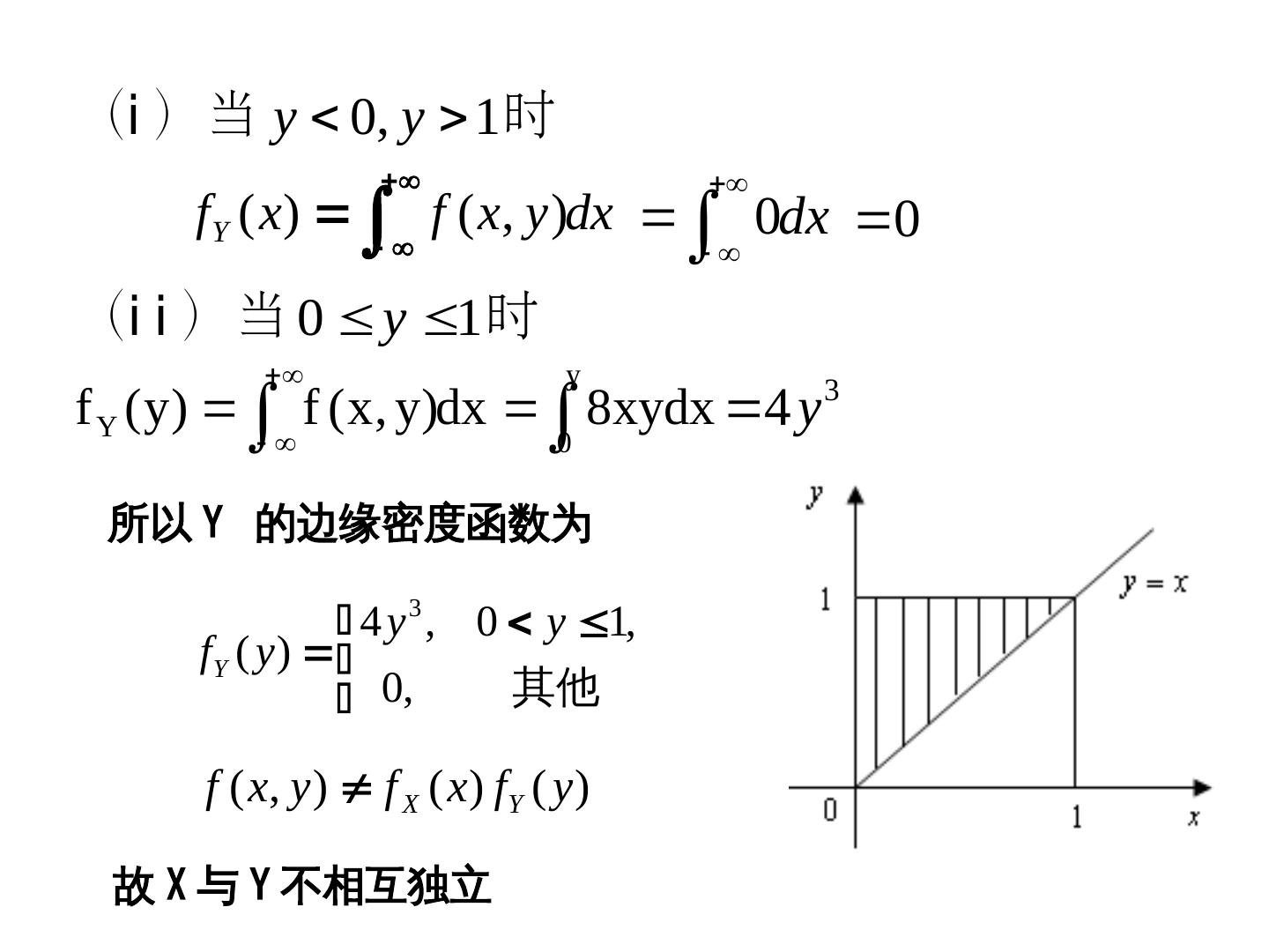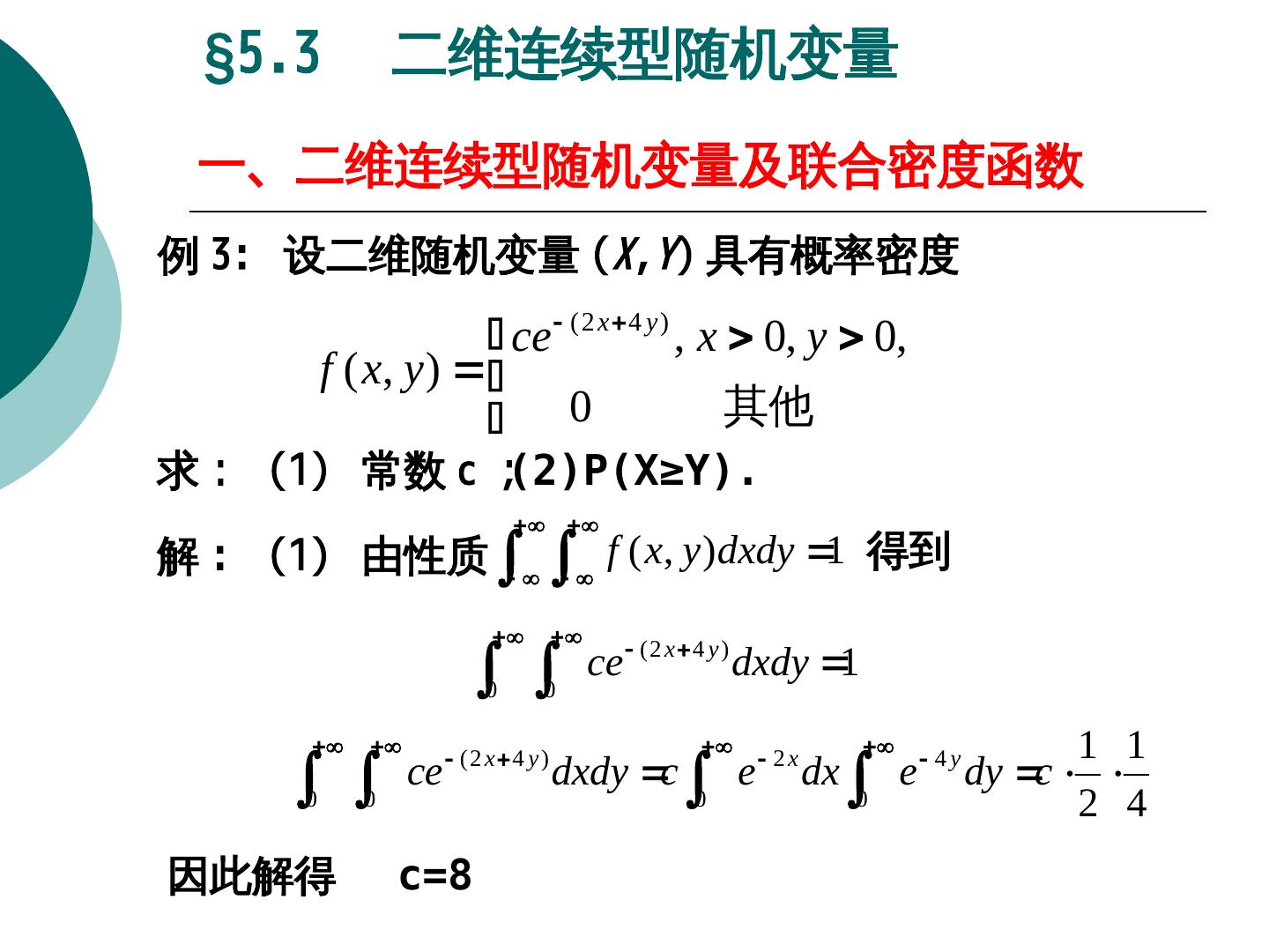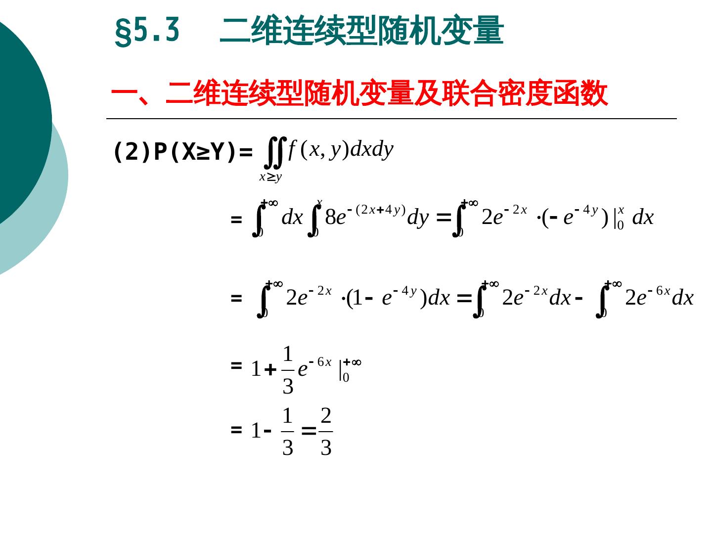 20 .§5.3 二维连续型随机变量 一、二维连续型随机变量及联合密度函数 (2)P(X≥Y)= f ( x, y)dxdy x y x dx 8e dy 2e 2 x ( e 4 y ) |0x dx (2 x4 y ) = 0 0 0 )dx 2e 2x 4y 2x = 2e (1 e dx 2e 6 x dx 0 0 0 = 1 1 6 x e |0 3 1 2 = 1 3 3