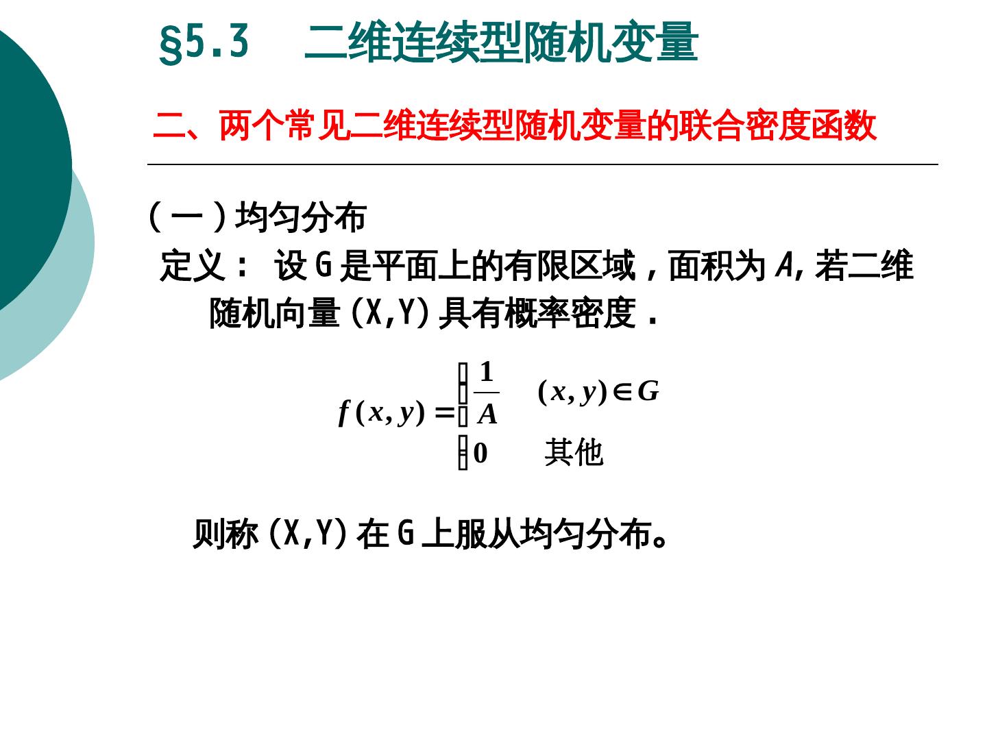 21 .§5.3 二维连续型随机变量 二、两个常见二维连续型随机变量的联合密度函数 (X,Y) 一 ) 均匀分布 定义 : 设 G 是平面上的有限区域 , 面积为 A, 若二维 随机向量 (X,Y)X,Y) 具有概率密度 . 1 ( x, y) G f ( x , y ) A 0 其他 则称 (X,Y)X,Y) 在 G 上服从均匀分布。