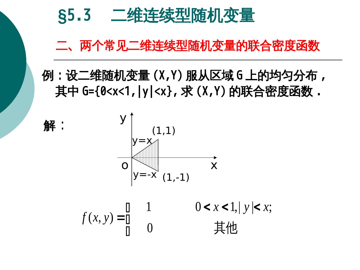 22 . §5.3 二维连续型随机变量 二、两个常见二维连续型随机变量的联合密度函数 例:设二维随机变量 (X,Y)X,Y) 服从区域 G 上的均匀分布 , 其中 G={0<x<1,|y|<x}, 求 (X,Y)X,Y) 的联合密度函数 . y 解: (1,1) y=x o x y=-x (1,-1) 1 0 x 1, | y | x; f ( x, y ) 0 其他