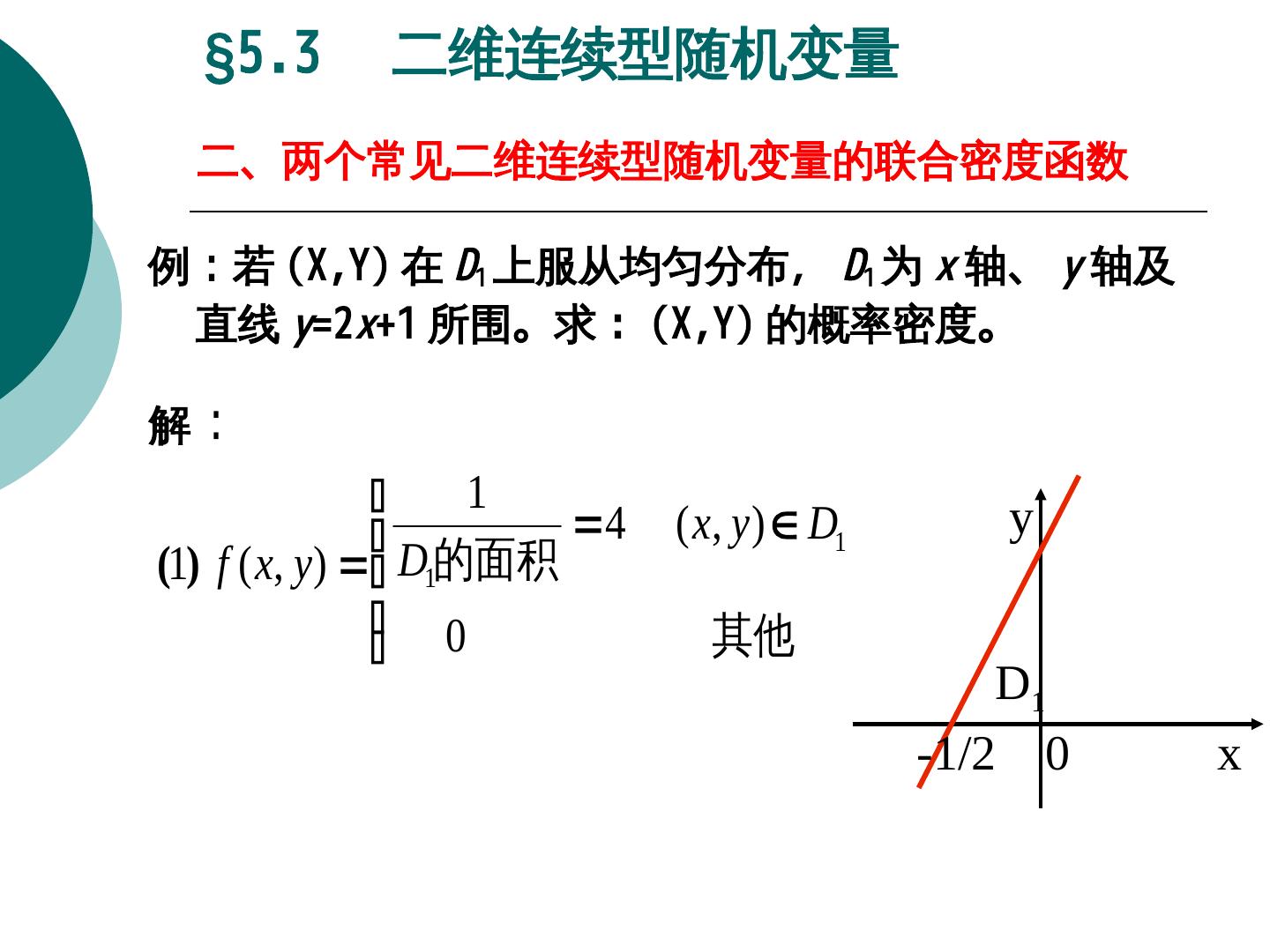 23 . §5.3 二维连续型随机变量 二、两个常见二维连续型随机变量的联合密度函数 例:若 (X,Y)X,Y) 在 D1 上服从均匀分布, D1 为 x 轴、 y 轴及 直线 y=2x+1 所围。求 : (X,Y)X,Y) 的概率密度。 解: 1 4 ( x, y ) D1 y (1) f ( x, y ) D1的面积 0 其他 D1 -1/2 0 x