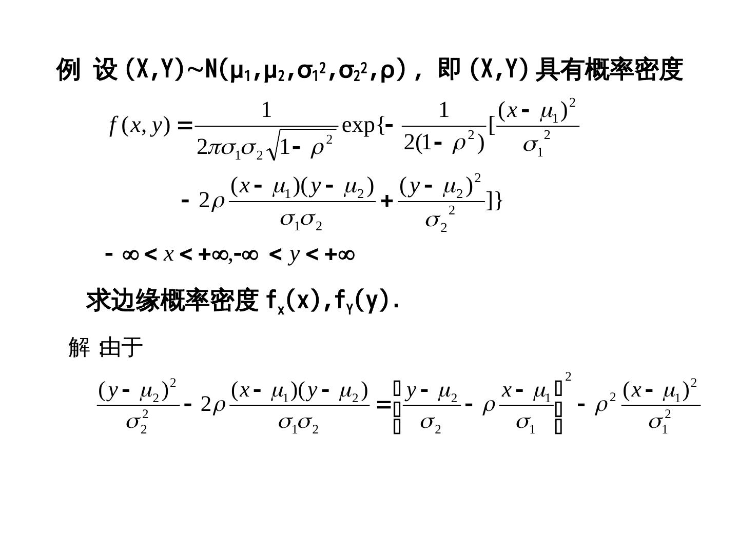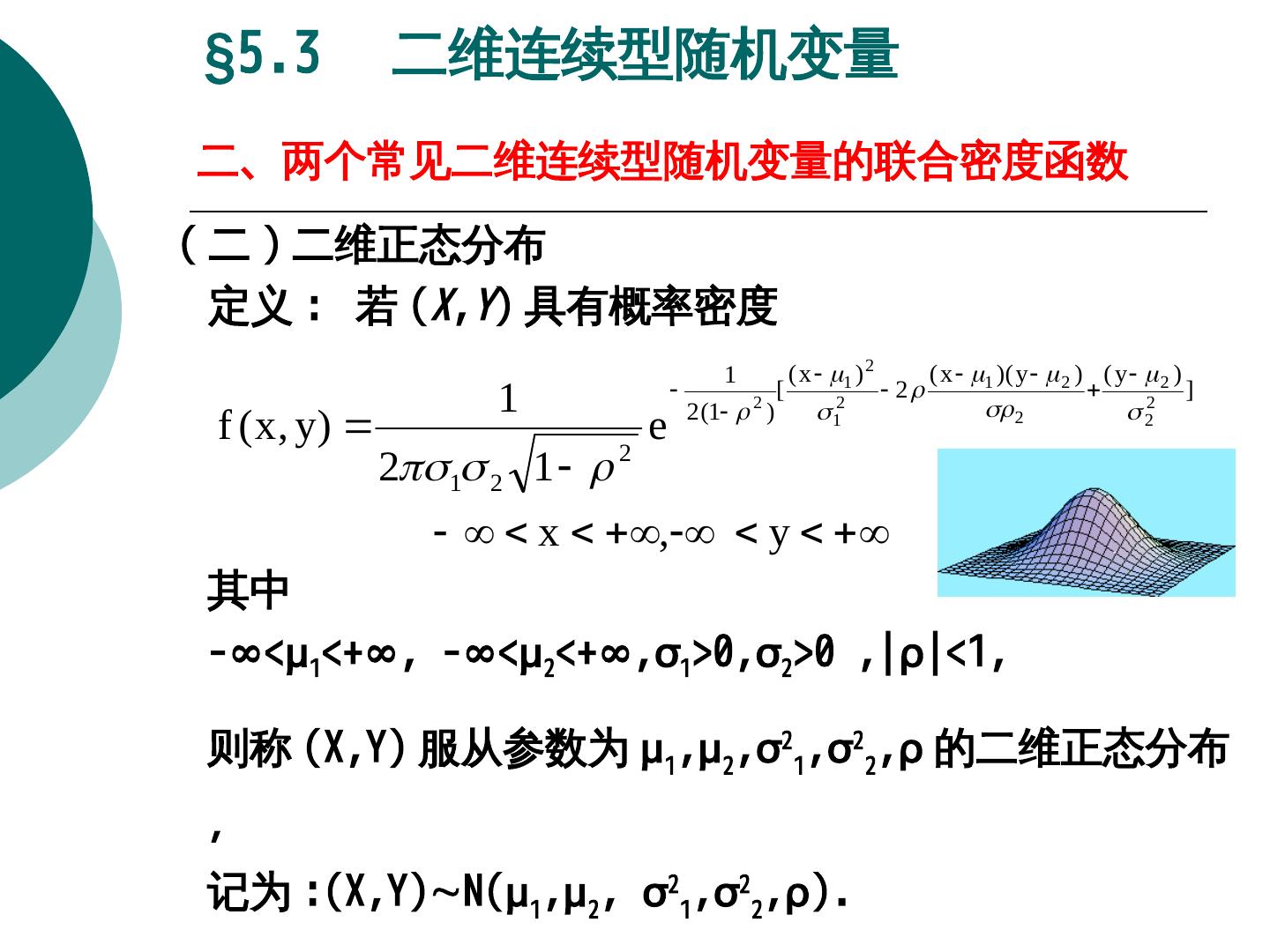 24 . §5.3 二维连续型随机变量 二、两个常见二维连续型随机变量的联合密度函数 (X,Y) 二 ) 二维正态分布 定义 : 若 (X,Y)X,Y) 具有概率密度 1 ( x 1 ) 2 ( x 1 )( y 2 ) ( y 2 ) 1 2 2 (1 ) [ 12 2 2 22 ] f ( x , y) e 2 1 2 1 2 x , y 其中 -∞<μ1<+∞, -∞<μ2<+∞,σ1>0,σ2>0 ,|ρ|<1, 则称 (X,Y)X,Y) 服从参数为 μ1,μ2,σ21,σ22,ρ 的二维正态分布 , 记为 :(X,Y)X,Y)N(X,Y)μ1,μ2, σ21,σ22,ρ).