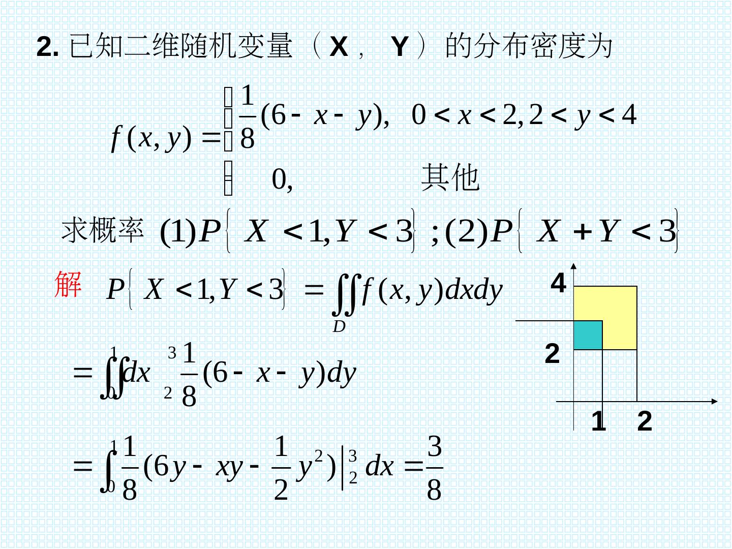 26 .2. 已知二维随机变量( X , Y )的分布密度为 的分布密度为 1 (6 x y ), 0 x 2, 2 y 4 f ( x, y ) 8 0, 其他 求概率 (1) P X 1, Y 3 ; (2) P X Y 3 解 P X 1, Y 3 4 f ( x, y )dxdy D 1 1 3 2 dx (6 x y )dy 0 2 8 1 2 11 1 2 3 3 (6 y xy y ) 2 dx 08 2 8