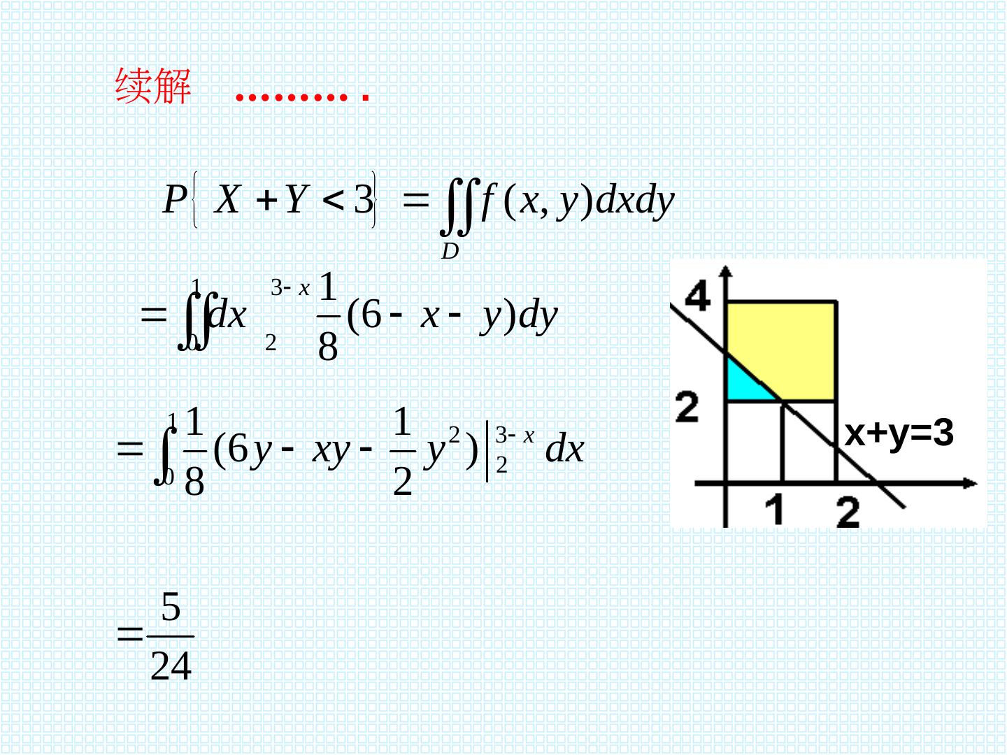 27 .续解 ……… . P X Y 3 f ( x, y )dxdy D 1 3 x 1 dx (6 x y )dy 0 2 8 1 1 1 2 x+y=3 (6 y xy y ) 3 x 2 dx 08 2 5 24
