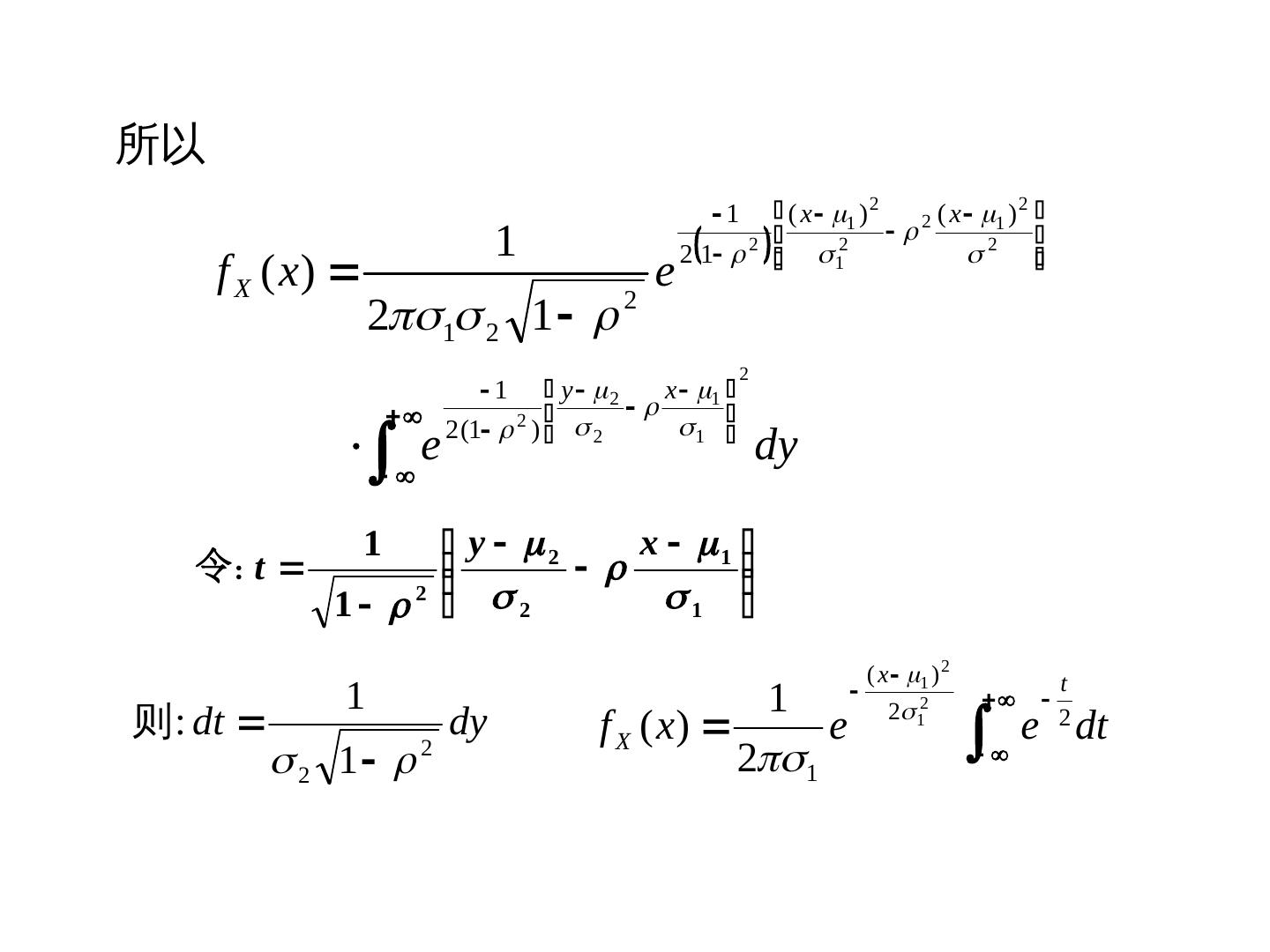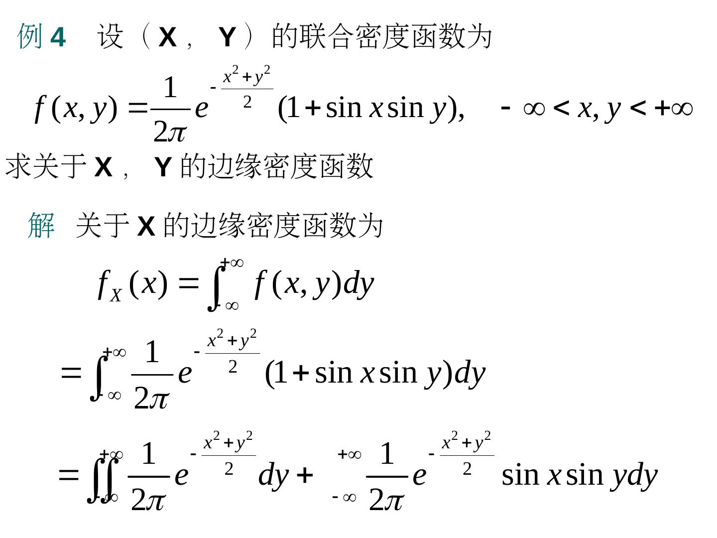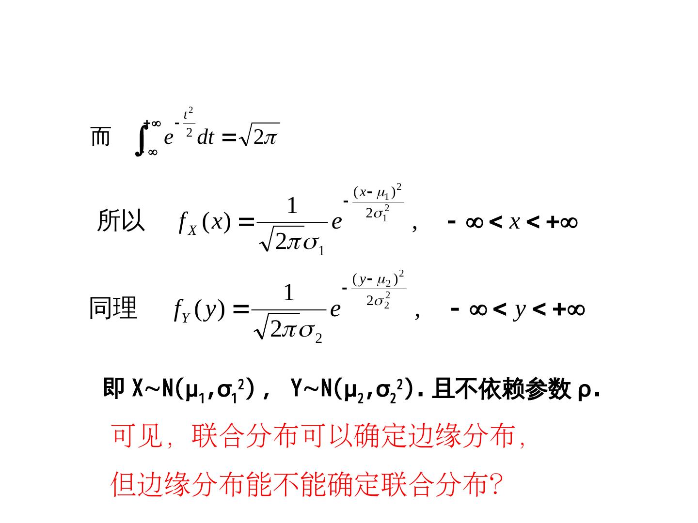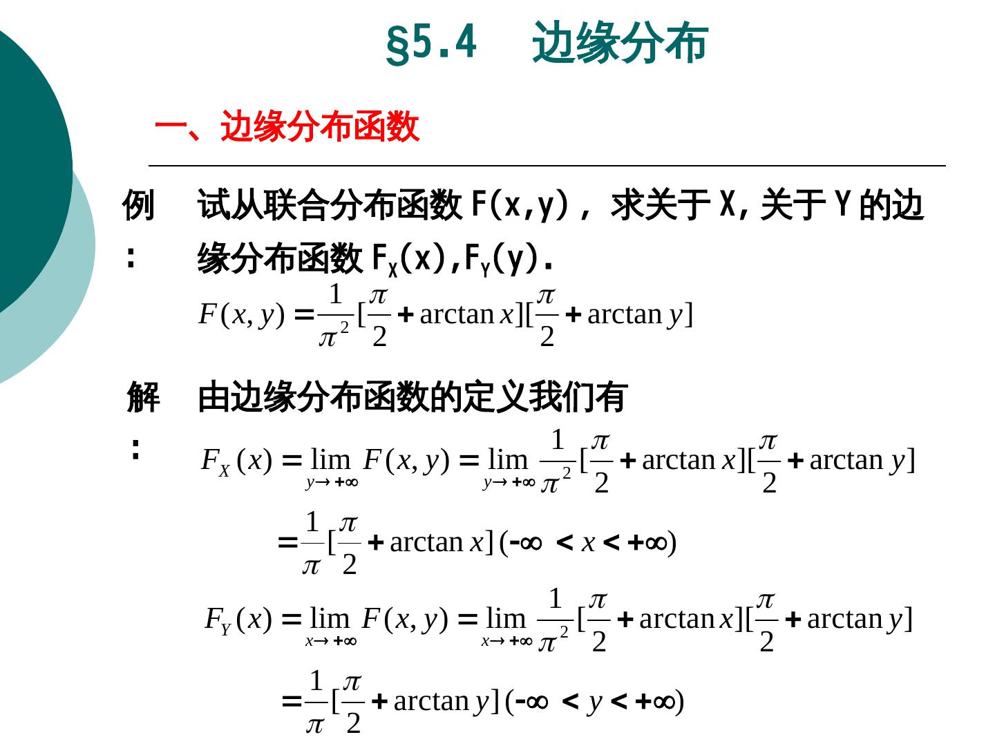 29 . §5.4 边缘分布 一、边缘分布函数 例 试从联合分布函数 F(X,Y)x,y) ,求关于 X, 关于 Y 的边 : 缘分布函数 FX(X,Y)x),FY(X,Y)y). 1 F ( x, y ) 2 [ arctan x][ arctan y ] 2 2 解 由边缘分布函数的定义我们有 : 1 FX ( x) lim F ( x, y ) lim 2 [ arctan x][ arctan y ] y y 2 2 1 [ arctan x] ( x ) 2 1 FY ( x) lim F ( x, y ) lim 2 [ arctan x][ arctan y ] x x 2 2 1 [ arctan y ] ( y ) 2