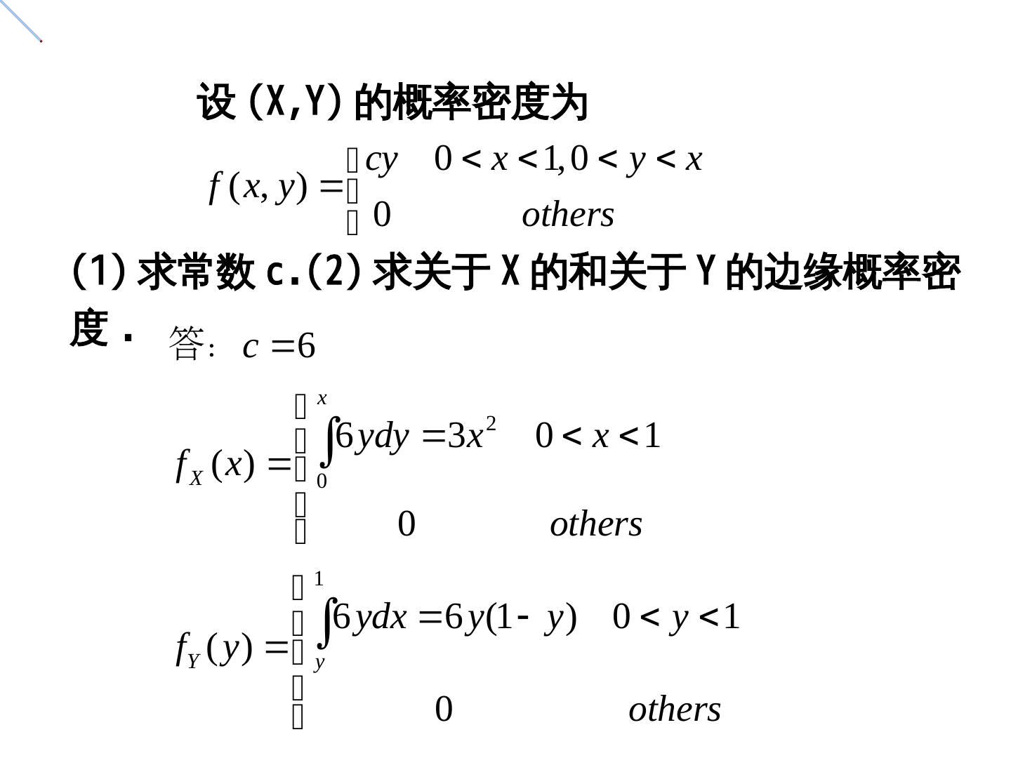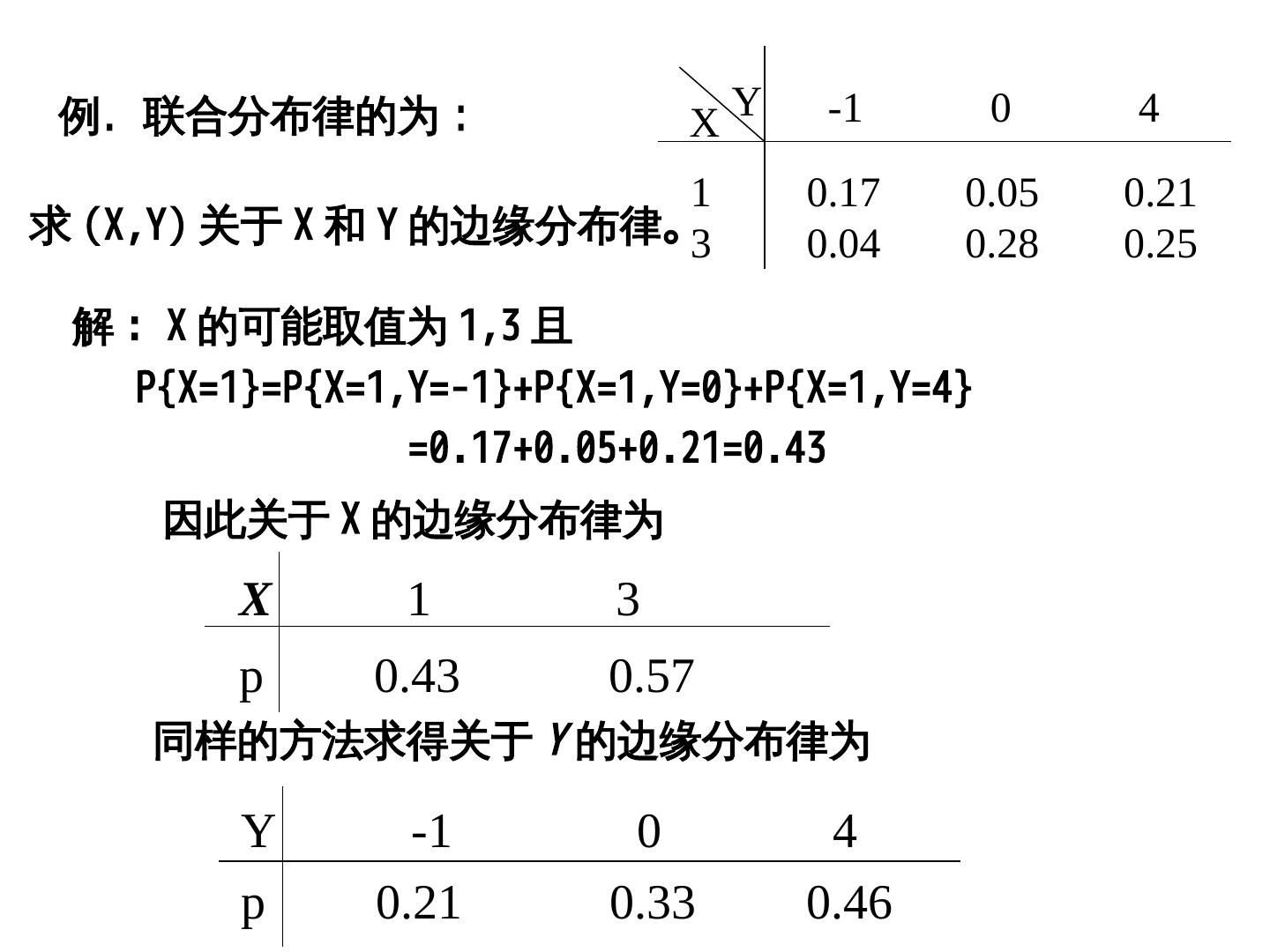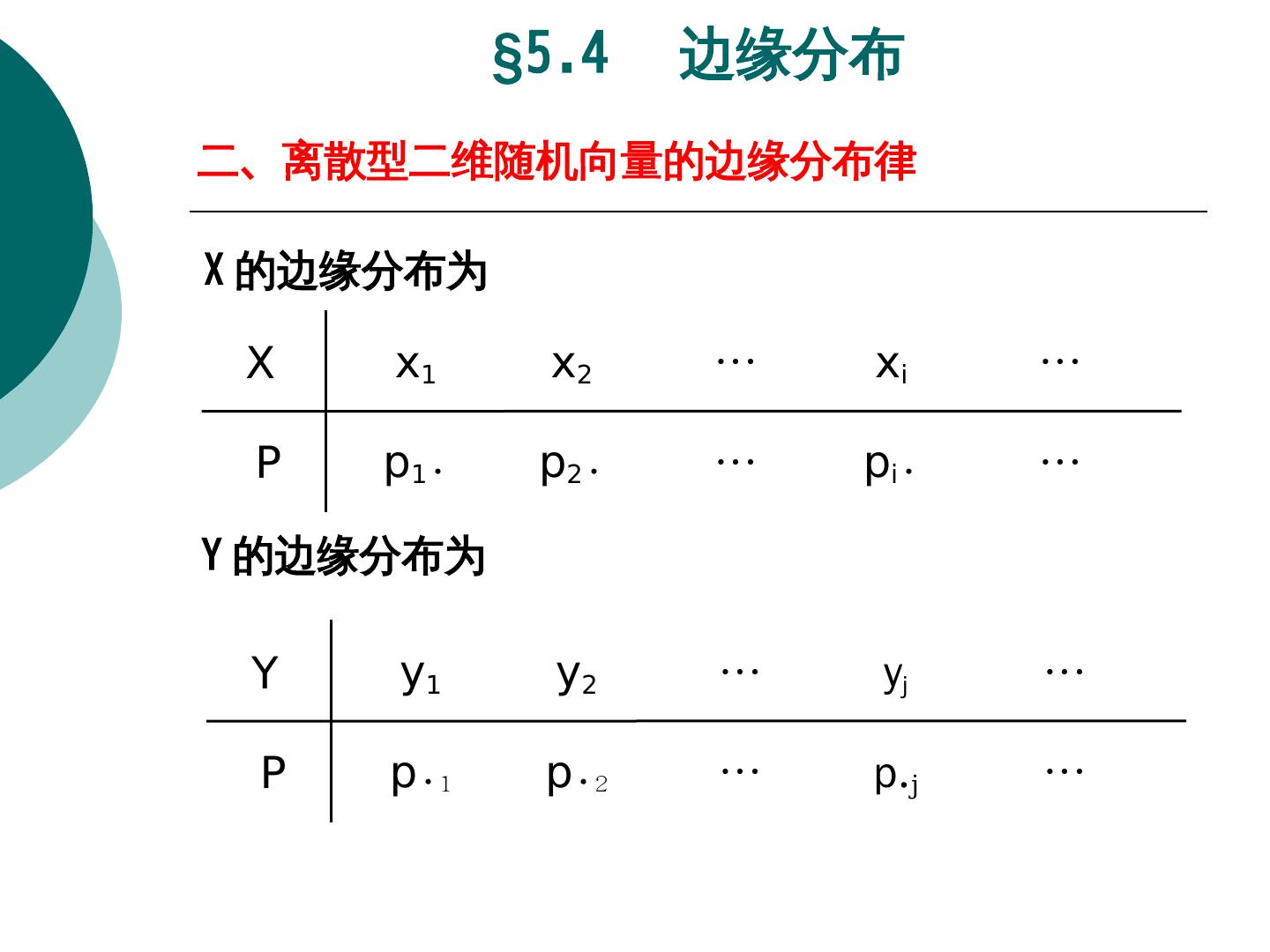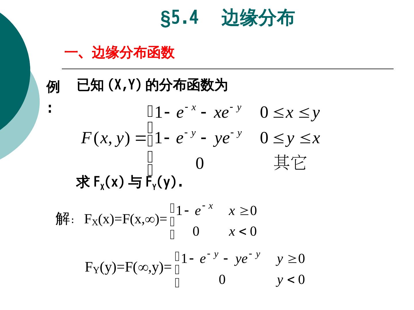 28 . §5.4 边缘分布 一、边缘分布函数 1 .边缘分布 设 F(X,Y)x,y) 为二维随机变量 (X,Y)X,Y) 的联合分布函数,称 P(X,Y)X≤x)=P(X,Y)X≤x,Y<+∞) (X,Y)-∞<x<+∞) 为 X 的边缘分布函数 , 并记为 Fx(X,Y)x). 2. 公式 . 由于 Fx(X,Y)x)=P(X,Y){X≤x}∩{Y<+∞})=P{X≤x,Y<+∞} =F(X,Y)x,+∞) 同理有 FY(X,Y)y)=F(X,Y)+∞,y).