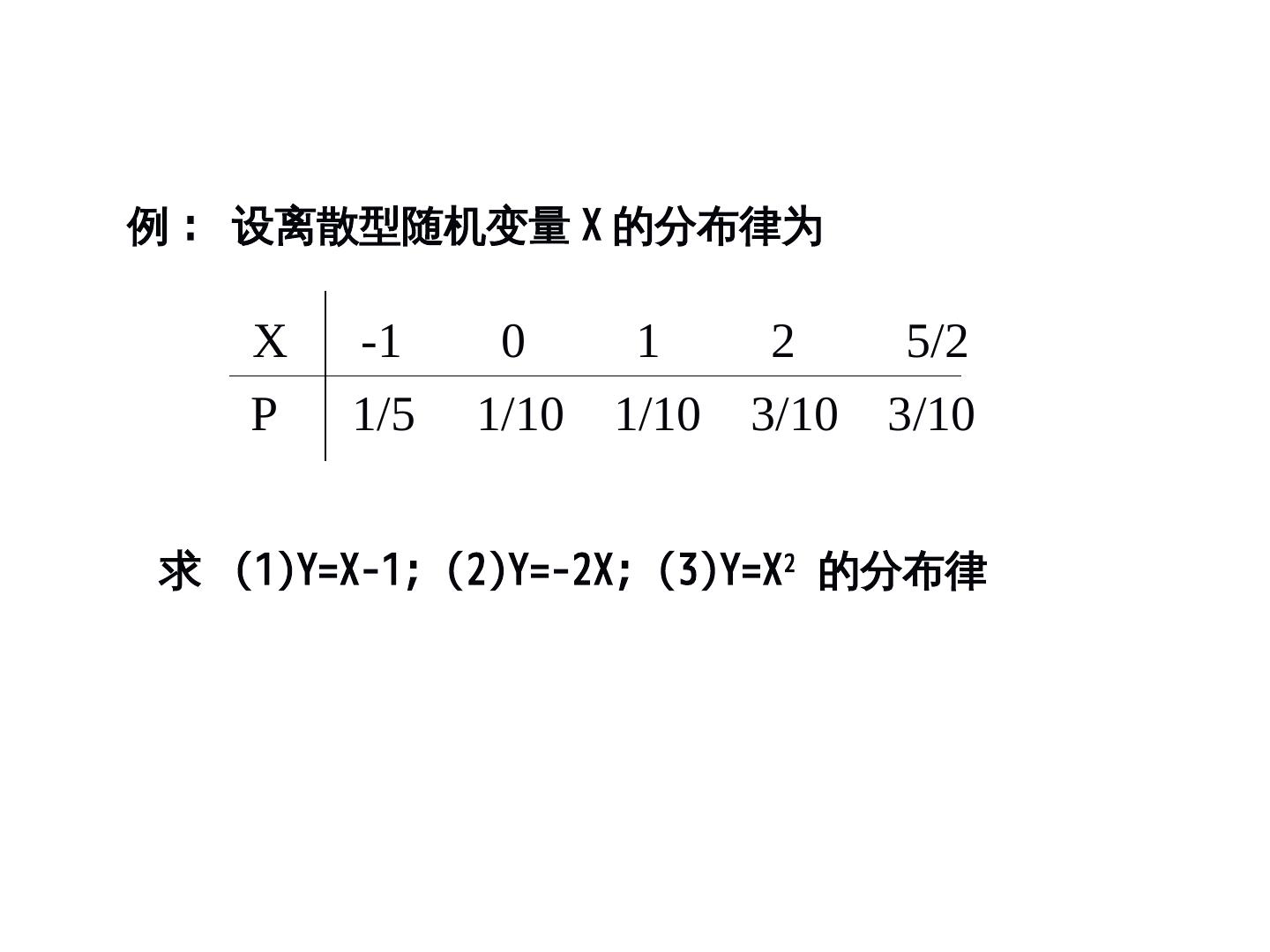 6 .例 : 设离散型随机变量 X 的分布律为 X -1 0 1 2 5/2 P 1/5 1/10 1/10 3/10 3/10 求 (1)Y=X-1; (2)Y=-2X; (3)Y=XY=X-1; (2)Y=X-1; (2)Y=-2X; (3)Y=XY=-2X; (3)Y=X-1; (2)Y=-2X; (3)Y=XY=X2 的分布律