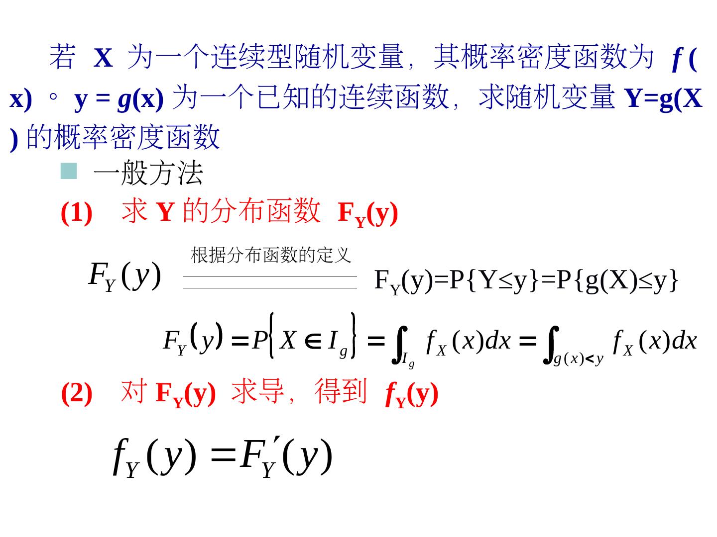 9 . 若 X 为一个连续型 随机变量随机变量,其概率密度函数为 f ( x) 。 y = g(x) 为一个已知的连续函数,求随机变量 Y=g(X ) 的概率密度函数 一般方法 (1) 求 Y 的分布函数 FY(y) 根据分布函数的定义 FY ( y ) FY(y)=P{Y≤y}=P{g(X)≤y} FY y P X I g f X ( x)dx Ig g ( x ) y f X ( x)dx (2) 对 FY(y) 求导,得到 fY(y) fY ( y ) FY( y )