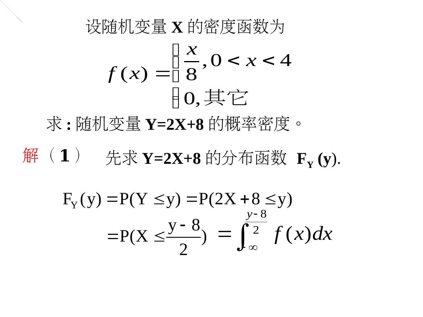 12 .( 2 ) 求 Y=2X+8 的概率密度 y 8 y 8 fY ( y ) FY( y ) f 2 2 1 y 8 1 y 8 , 0 4 8 2 2 2 0, 其它 y 8 , 8 y 16 32 0, 其它