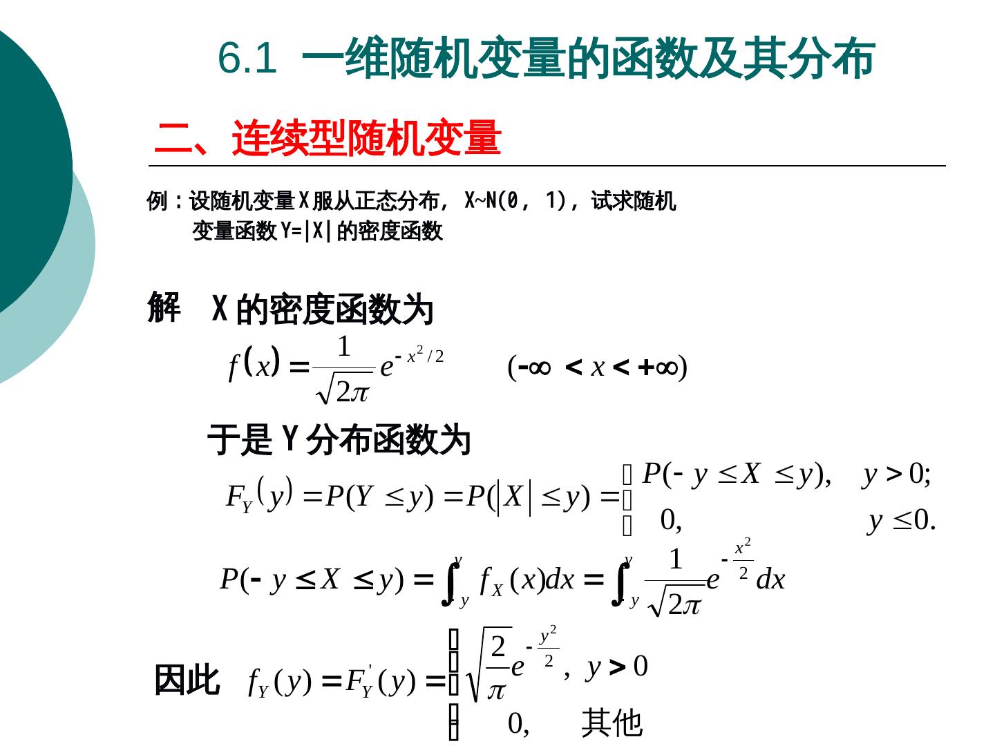 13 . 6.1 一维随机变量的函数及其分布 二、连续型随机变量 例:设随机变量 X 服从正态分布, X~N(0 , 1)Y=X-1; (2)Y=-2X; (3)Y=X ,试求随机 变量函数 Y=|X| 的密度函数 解 X 的密度函数为 1 x2 / 2 f x e ( x ) 2 于是 Y 分布函数为 P( y X y ), y 0; FY y P(Y y ) P( X y ) 0, y 0. x2 y y 1 2 P( y X y ) f X ( x)dx e dx y y 2 2 y 2 e 2 , y0 因此 fY ( y ) FY ( y ) ' 0, 其他