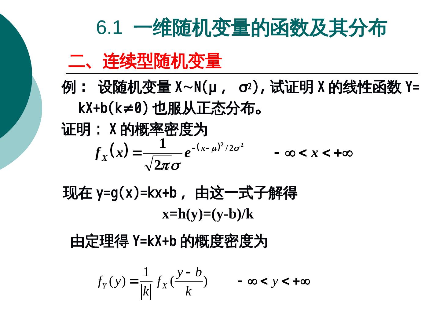 15 . 6.1 一维随机变量的函数及其分布 二、连续型随机变量 例 : 设随机变量 XN(μ , σ2)Y=X-1; (2)Y=-2X; (3)Y=X,P(X 试证明 X 的线性函数 Y= kX+b(k≠0)Y=X-1; (2)Y=-2X; (3)Y=X 也服从正态分布。 证明: X 的概率密度为 1 f X x x / 2 2 2 e x 2 现在 y=g(x)Y=X-1; (2)Y=-2X; (3)Y=X=kx+b ,由这一式子解得 x=h(y)=(y-b)/k 由定理得 Y=kX+b 的概度密度为 1 y b fY ( y ) fX ( ) y k k