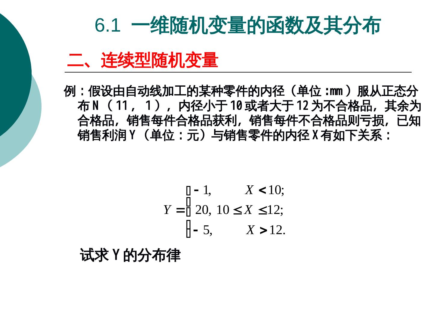 18 . 6.1 一维随机变量的函数及其分布 二、连续型随机变量 例:假设由自动线加工的某种零件的内径(单位 :mm )服从正态分服从正态分 布 N ( 11 , 1 )服从正态分,内径小于 10 或者大于 12 为不合格品,其余为 合格品,销售每件合格品获利,销售每件不合格品则亏损,已知 销售利润 Y (单位:元)服从正态分与销售零件的内径 X 有如下关系: 1, X 10; Y 20, 10 X 12; 5, X 12. 试求 Y 的分布律