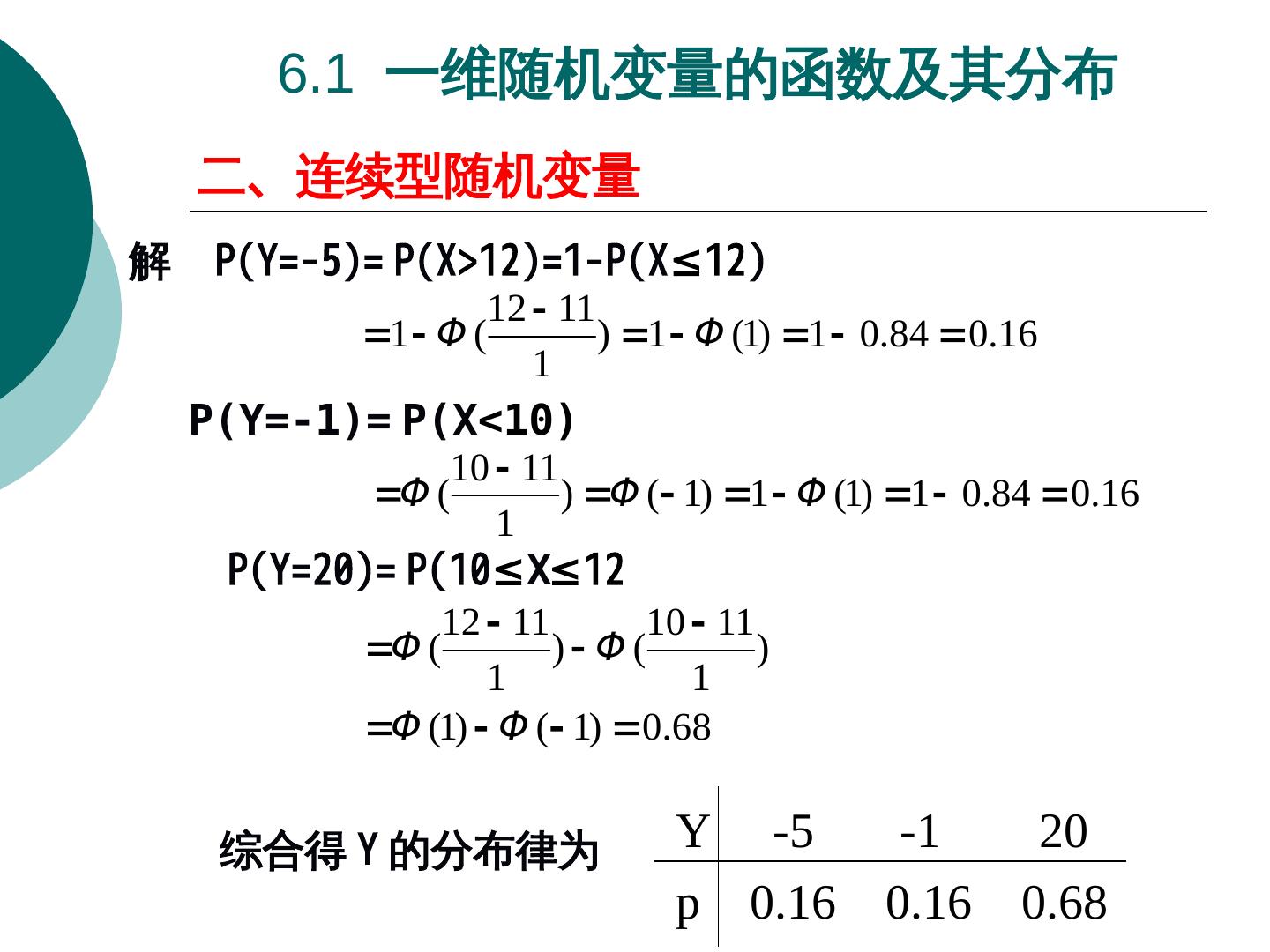 19 . 6.1 一维随机变量的函数及其分布 二、连续型随机变量 解 P(Y=-5)Y=X-1; (2)Y=-2X; (3)Y=X= P(X>12)Y=X-1; (2)Y=-2X; (3)Y=X=1-P(X≤12)Y=X-1; (2)Y=-2X; (3)Y=X 12 11 1 Φ ( ) 1 Φ (1) 1 0.84 0.16 1 P(Y=-1)= P(X<10) 10 11 Φ ( ) Φ ( 1) 1 Φ (1) 1 0.84 0.16 1 P(Y=20)Y=X-1; (2)Y=-2X; (3)Y=X= P(10≤X≤12 12 11 10 11 Φ ( ) Φ( ) 1 1 Φ (1) Φ ( 1) 0.68 综合得 Y 的分布律为 Y -5 -1 20 p 0.16 0.16 0.68