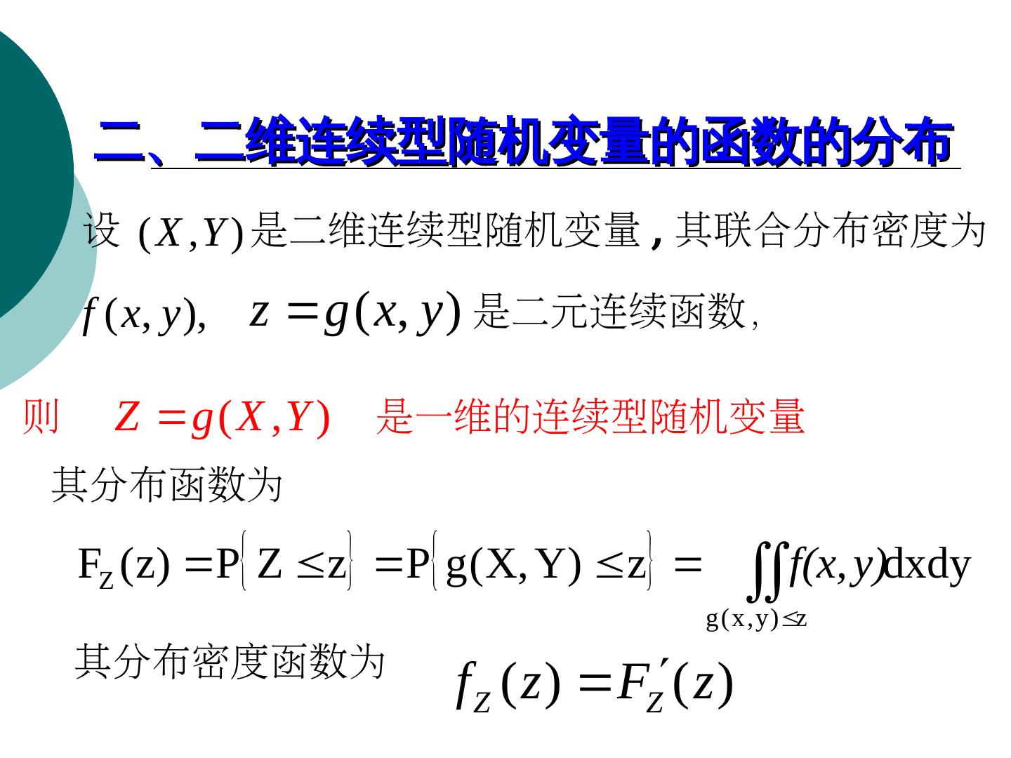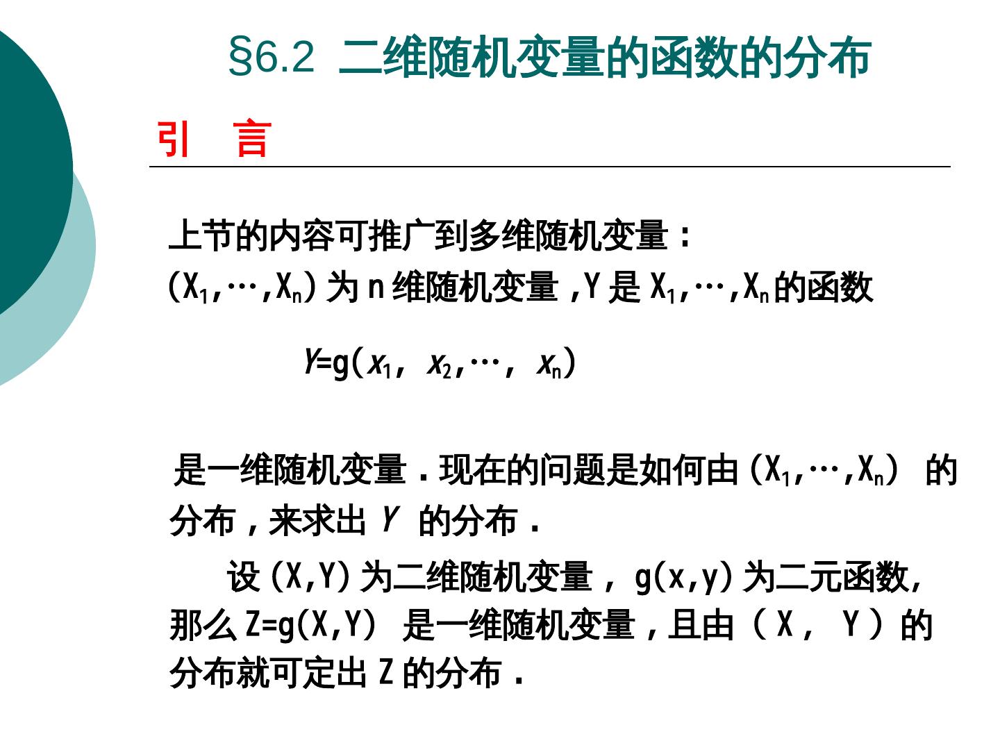 20 . §6.2 二维随机变量的函数的分布 引 言 上节的内容可推广到多维随机变量 : (X1,P(X…,P(XXn)Y=X-1; (2)Y=-2X; (3)Y=X 为 n 维随机变量 ,P(XY 是 X1,P(X…,P(XXn 的函数 Y=g(x1,P(X x2,P(X…,P(X xn)Y=X-1; (2)Y=-2X; (3)Y=X 是一维随机变量 . 现在的问题是如何由 (X1,P(X…,P(XXn)Y=X-1; (2)Y=-2X; (3)Y=X 的 分布 ,P(X 来求出 Y 的分布 . 设 (X,P(XY)Y=X-1; (2)Y=-2X; (3)Y=X 为二维随机变量 ,P(X g(x,P(Xy)Y=X-1; (2)Y=-2X; (3)Y=X 为二元函数, 那么 Z=g(X,P(XY)Y=X-1; (2)Y=-2X; (3)Y=X 是一维随机变量 ,P(X 且由( X , Y )服从正态分的 分布就可定出 Z 的分布 .
