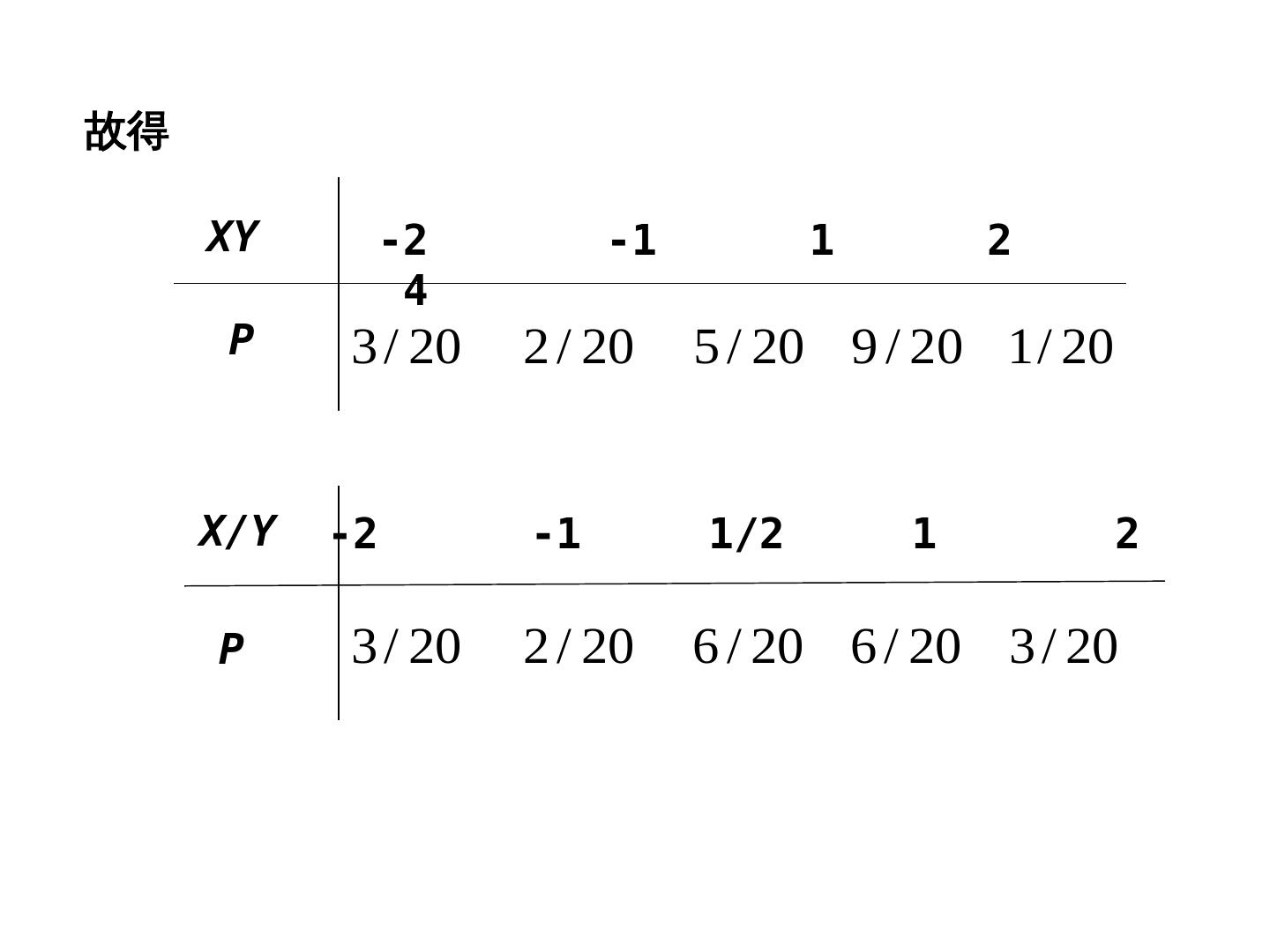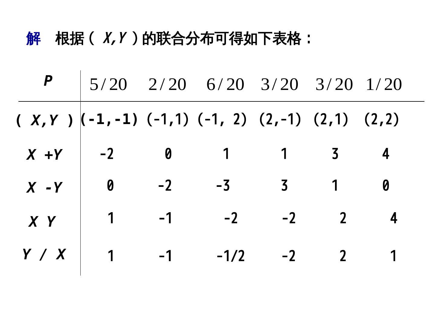 25 .故得 XY -2 -1 1 2 4 P 3 / 20 2 / 20 5 / 20 9 / 20 1 / 20 X/Y -2 -1 1/2 1 2 P 3 / 20 2 / 20 6 / 20 6 / 20 3 / 20