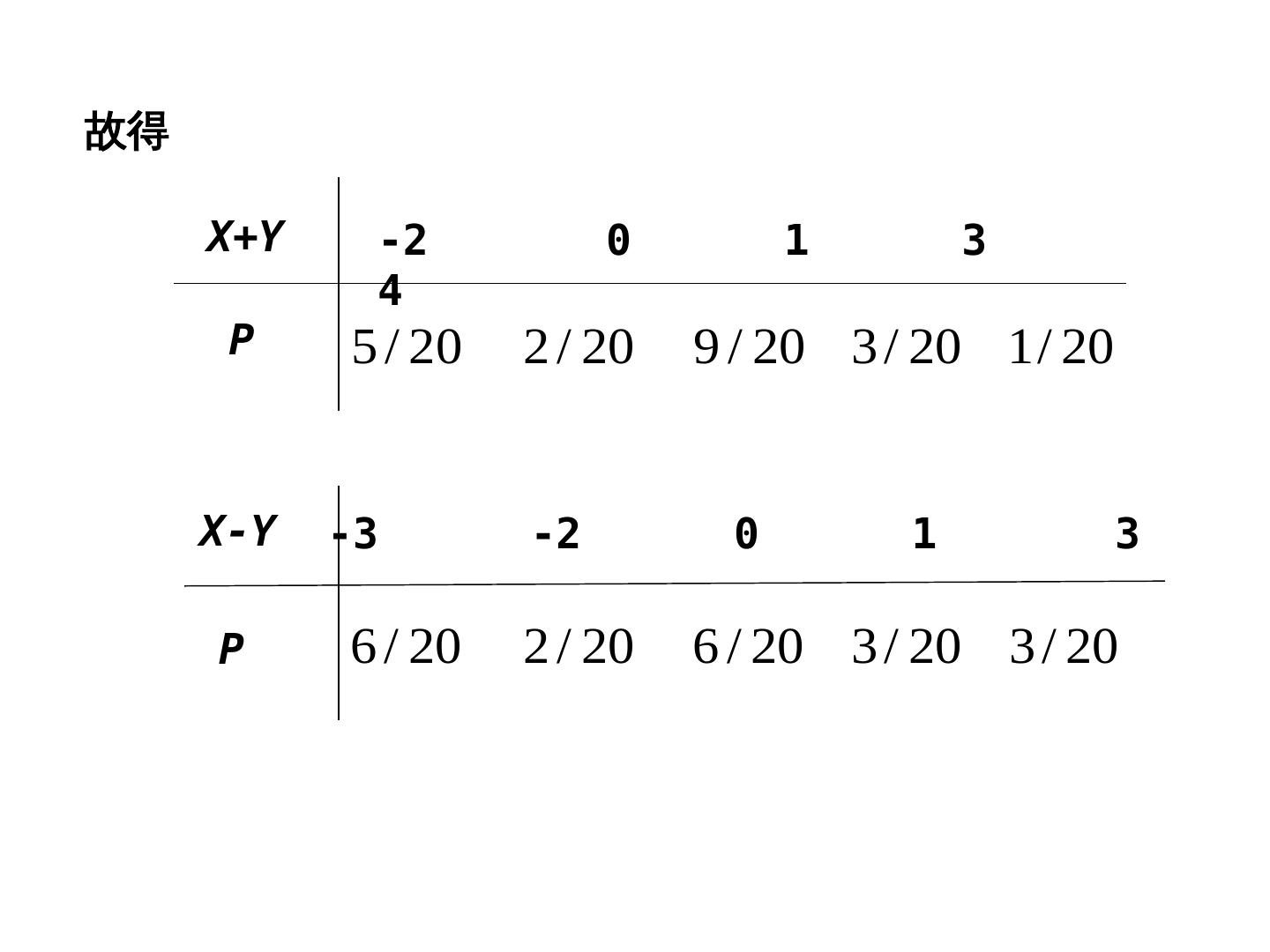 24 .故得 X+Y -2 0 1 3 4 P 5 / 20 2 / 20 9 / 20 3 / 20 1 / 20 X-Y -3 -2 0 1 3 P 6 / 20 2 / 20 6 / 20 3 / 20 3 / 20