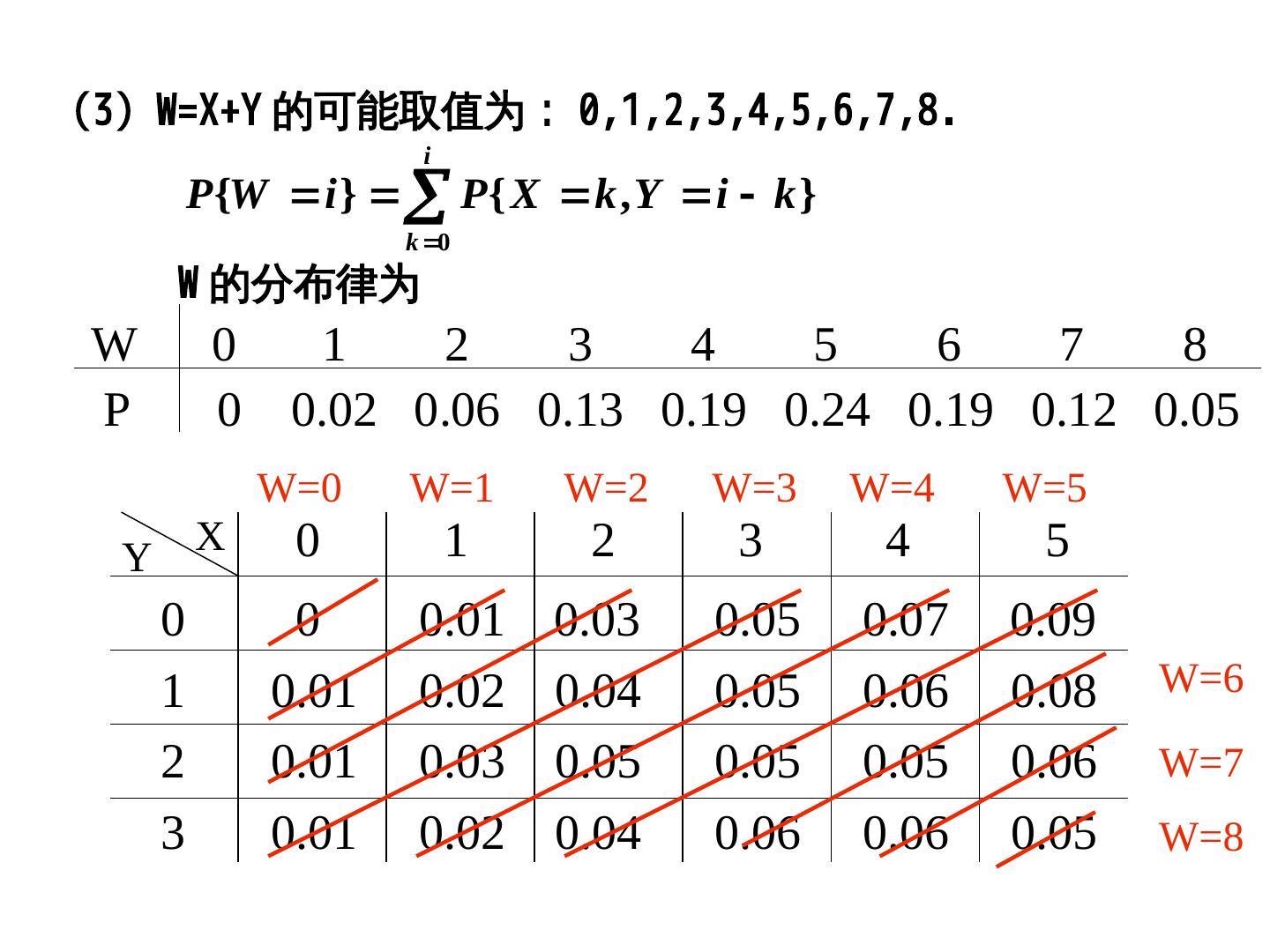 29 .(3)Y=X-1; (2)Y=-2X; (3)Y=X W=X+Y 的可能取值为: 0,P(X1,P(X2,P(X3,P(X4,P(X5,P(X6,P(X7,P(X8. i P {W i } P{ X k , Y i k } k 0 W 的分布律为 W 0 1 2 3 4 5 6 7 8 P 0 0.02 0.06 0.13 0.19 0.24 0.19 0.12 0.05 W=0 W=1 W=2 W=3 W=4 W=5 Y X 0 1 2 3 4 5 0 0 0.01 0.03 0.05 0.07 0.09 1 0.01 0.02 0.04 0.05 0.06 0.08 W=6 2 0.01 0.03 0.05 0.05 0.05 0.06 W=7 3 0.01 0.02 0.04 0.06 0.06 0.05 W=8