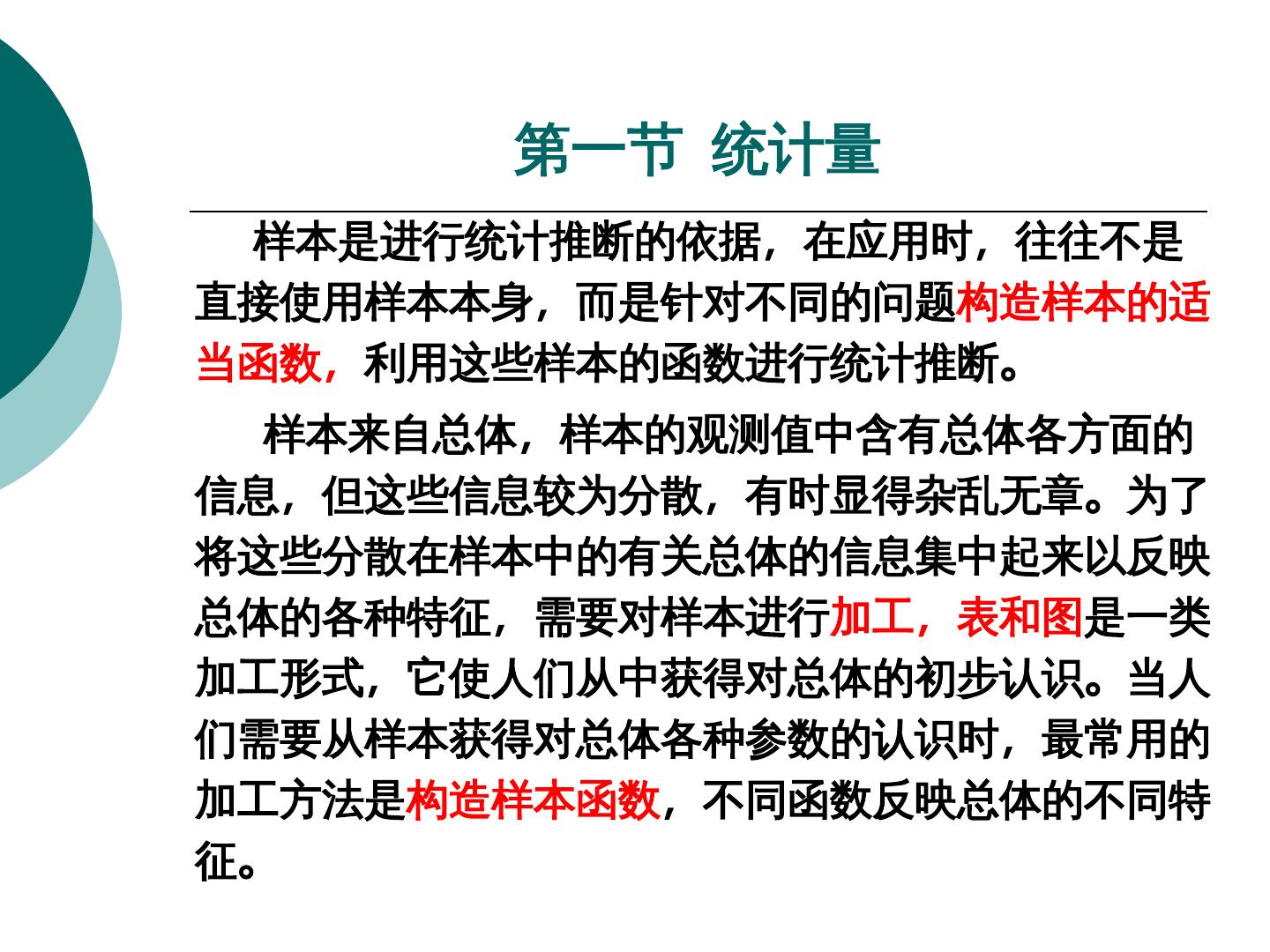 2 . 第一节 统计量 样本是进行统计推断的依据,在应用时,往往不是 直接使用样本本身,而是针对不同的问题构造样本的适 当函数,利用这些样本的函数进行统计推断。 样本来自总体,样本的观测值中含有总体各方面的 信息,但这些信息较为分散,有时显得杂乱无章。为了 将这些分散在样本中的有关总体的信息集中起来以反映 总体的各种特征,需要对样本进行加工,表和图是一类 加工形式,它使人们从中获得对总体的初步认识。当人 们需要从样本获得对总体各种参数的认识时,最常用的 加工方法是构造样本函数,不同函数反映总体的不同特 征。