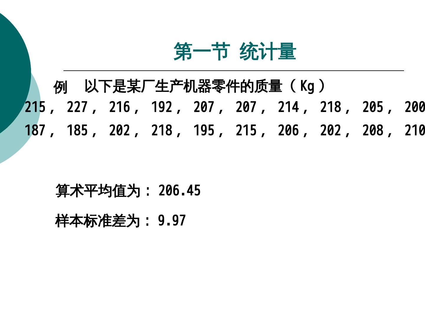 3 . 第一节 统计量 例 以下是某厂生产机器零件的质量( Kg ) 215 , 227 , 216 , 192 , 207 , 207 , 214 , 218 , 205 , 200 187 , 185 , 202 , 218 , 195 , 215 , 206 , 202 , 208 , 210 算术平均值为: 206.45 样本标准差为: 9.97