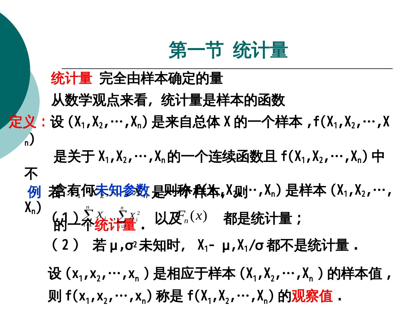 4 . 第一节 统计量 统计量 完全由样本确定的量 从数学观点来看,统计量是样本的函数 定义:设 (XX1,X2,…,Xn) 是来自总体 X 的一个样本 ,f(XX1,X2,…,X n) 是关于 X1,X2,…,Xn 的一个连续函数且 f(XX1,X2,…,Xn) 中 不 例 若 含有何未知参数 , 则称 f(XX1,X2,…,Xn) 是样本 (XX1,X2,…, X 1 , X 2 , , X n 是一个样本,则 Xn) n n (的一个统计量 1) X , X i2 i 以及 Fn ( x ) 都是统计量; i 1 i 1 . ( 2 ) 若 μ,σ2 未知时, X1- μ,X1/σ 都不是统计量 . 设 (Xx1,x2,…,xn ) 是相应于样本 (XX1,X2,…,Xn ) 的样本值 , 则 f(Xx1,x2,…,xn) 称是 f(XX1,X2,…,Xn) 的观察值 .