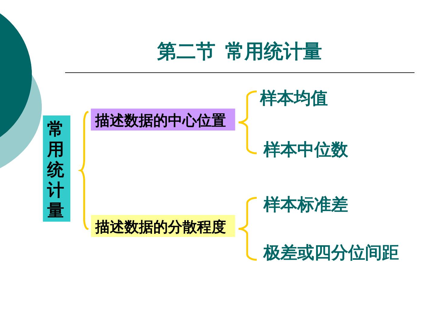 5 . 第二节 常用统计量 样本均值 描述数据的中心位置 常 用 样本中位数 统 计 量 样本标准差 描述数据的分散程度 极差或四分位间距