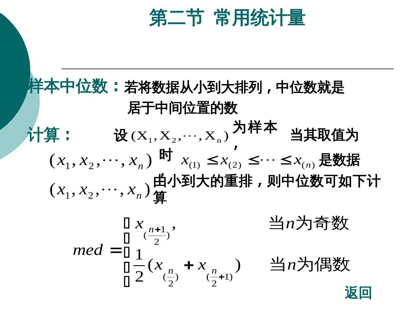 7 . 第二节 常用统计量 样本中位数 : 若将数据从小到大排列 , 中位数就是 居于中间位置的数 为样本 计算 : 设 ( X 1 , X 2 , , X n ) , 当其取值为 ( x1 , x 2 , , x n ) 时 x(1) x( 2 ) x( n ) 是数据 , 由小到大的重排 , 则中位数可如下计 ( x1 , x 2 , , x n ) 算 x n 1 , 当n为奇数 ( 2 ) med 1 ( x( n ) x( n 1) ) 当n为偶数 2 2 2 返回