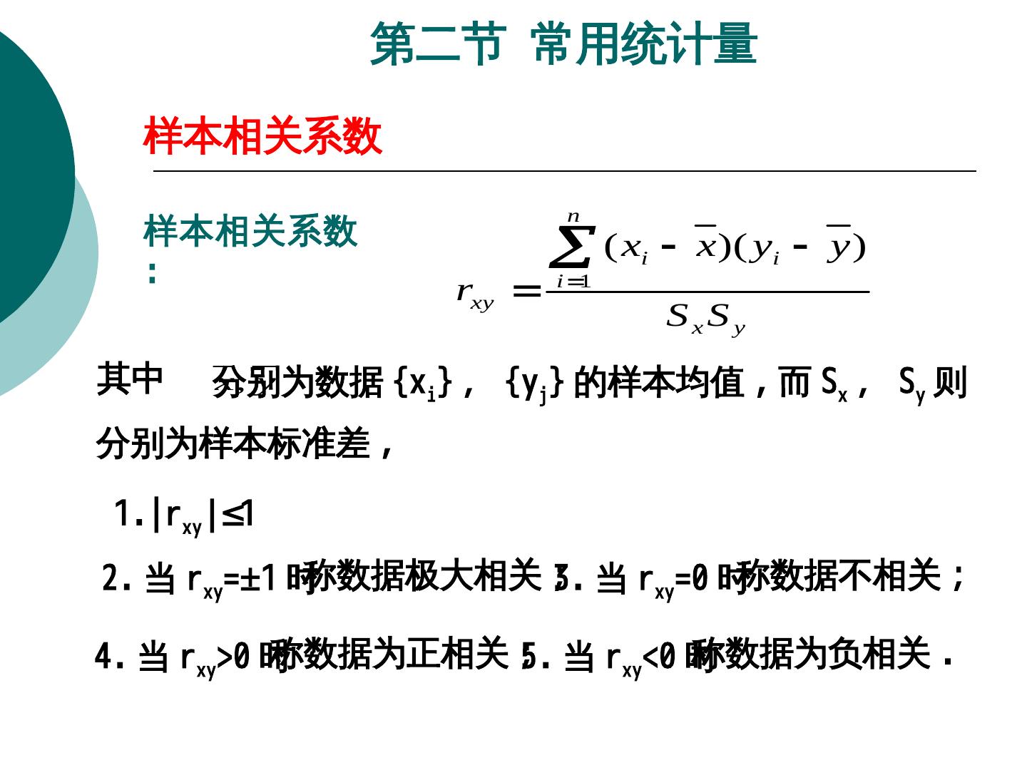 9 . 第二节 常用统计量 样本相关系数 n 样本相关系数 : (x i 1 i x )( yi y ) rxy SxS y 其中 分别为数据 x, y {xxi} , {xyj} 的样本均值 , 而 Sx , Sy 则 分别为样本标准差 , 1.|rxy|≤1 称数据极大相关; 2. 当 rxy=±1 时 3. 当 rxy=0 时称数据不相关; 称数据为正相关; 4. 当 rxy>0 时 称数据为负相关 . 5. 当 rxy<0 时