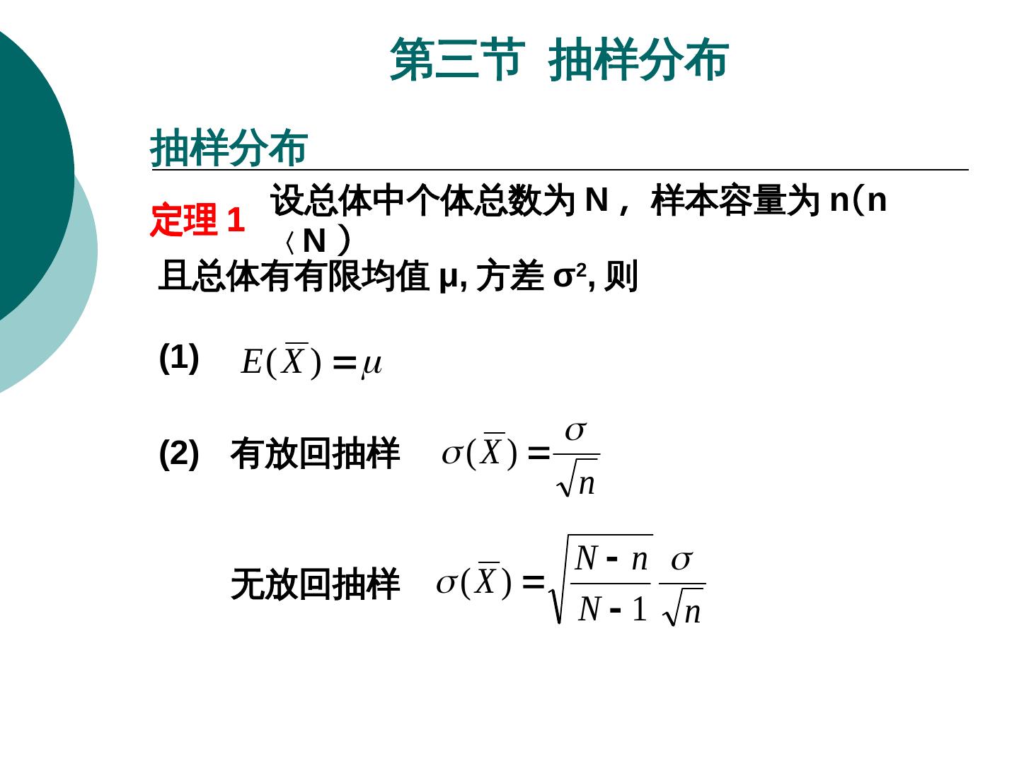 12 . 第三节 抽样分布 抽样分布 设总体中个体总数为 N ,样本容量为 n(Xn 定理 1 〈N ) 且总体有有限均值 μ, 方差 σ2, 则 (1) E ( X ) (2) 有放回抽样 (X ) n N n 无放回抽样 ( X ) N1 n