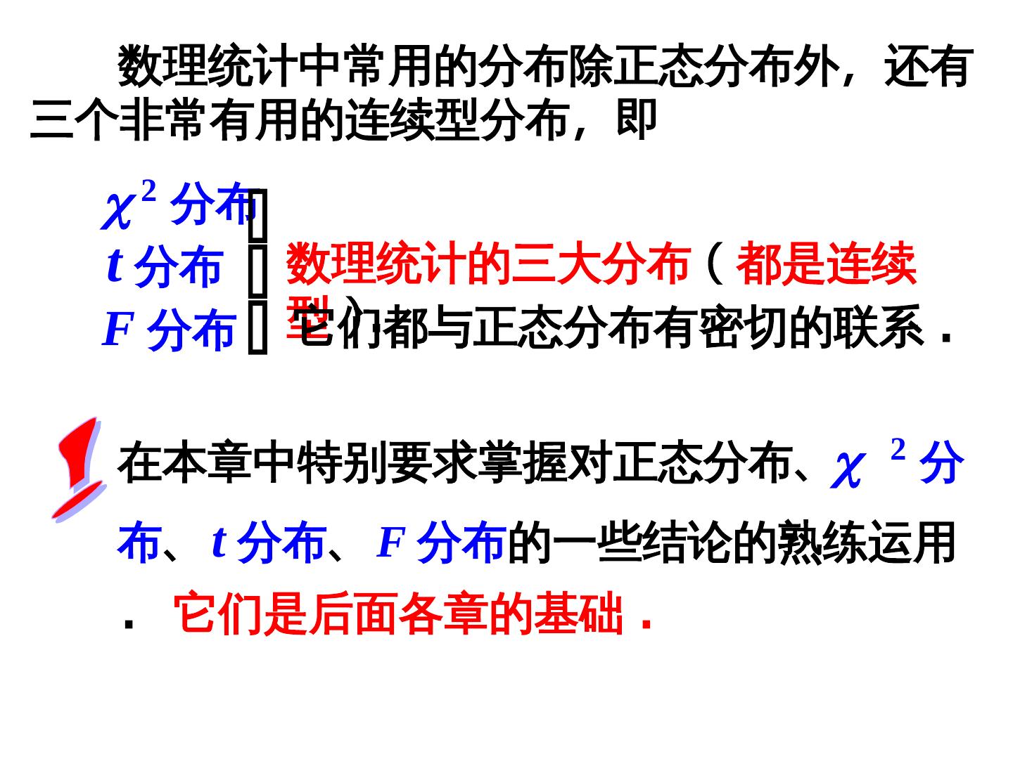13 . 数理统计中常用的分布除正态分布外,还有 三个非常有用的连续型分布,即 2 分布 t 分布 数理统计的三大分布 (X 都是连续 F 分布 型 ). 它们都与正态分布有密切的联系 . 在本章中特别要求掌握对正态分布、 2 分 布、 t 分布、 F 分布的一些结论的熟练运用 . 它们是后面各章的基础 .