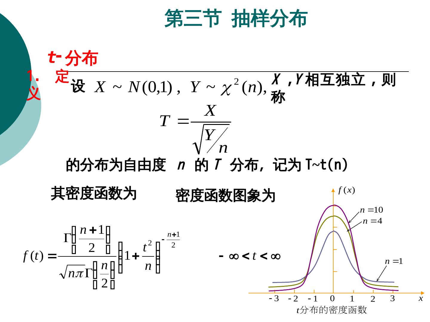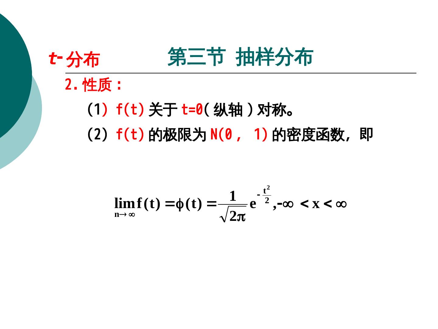 20 .t- 分布 第三节 抽样分布 2. 性质 : (X1) f(Xt) 关于 t=0(X 纵轴 ) 对称。 (X2) f(Xt) 的极限为 N(X0 , 1) 的密度函数,即 2 t lim f ( t ) ( t ) 1 e 2 , x n 2