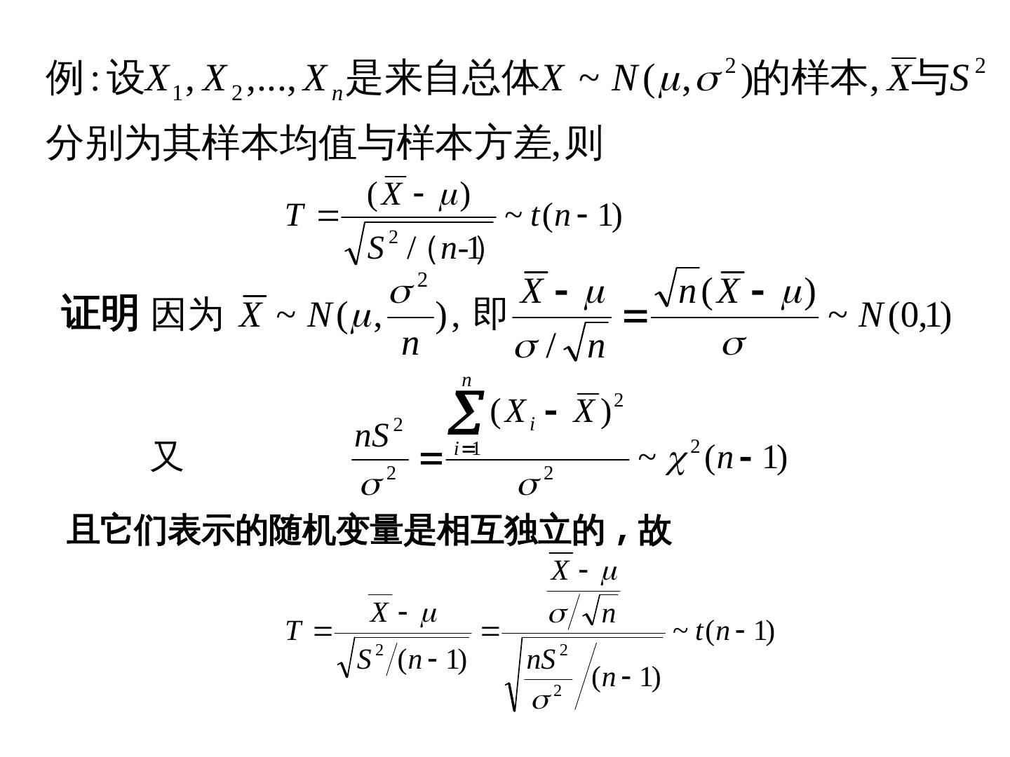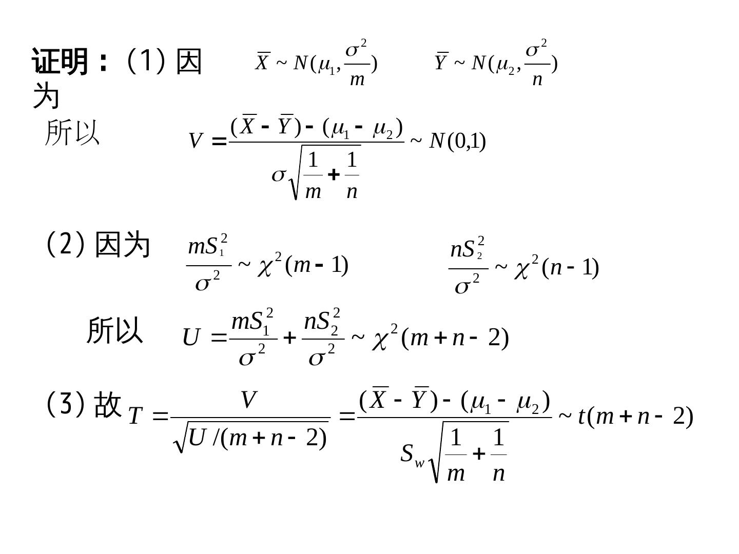26 . 2 2 证明 : (X1) 因 X ~ N ( 1 , ) Y ~ N (2 , ) m n 为 所以 ( X Y ) ( 1 2 ) V ~ N (0,1) 1 1 m n (X2) 因为 mS 12 nS 22 ~ 2 (m 1) ~ 2 (n 1) 2 2 所以 mS12 nS 22 U 2 2 ~ 2 ( m n 2) (X3) 故 T V ( X Y ) ( 1 2 ) ~ t (m n 2) U /(m n 2) 1 1 Sw m n