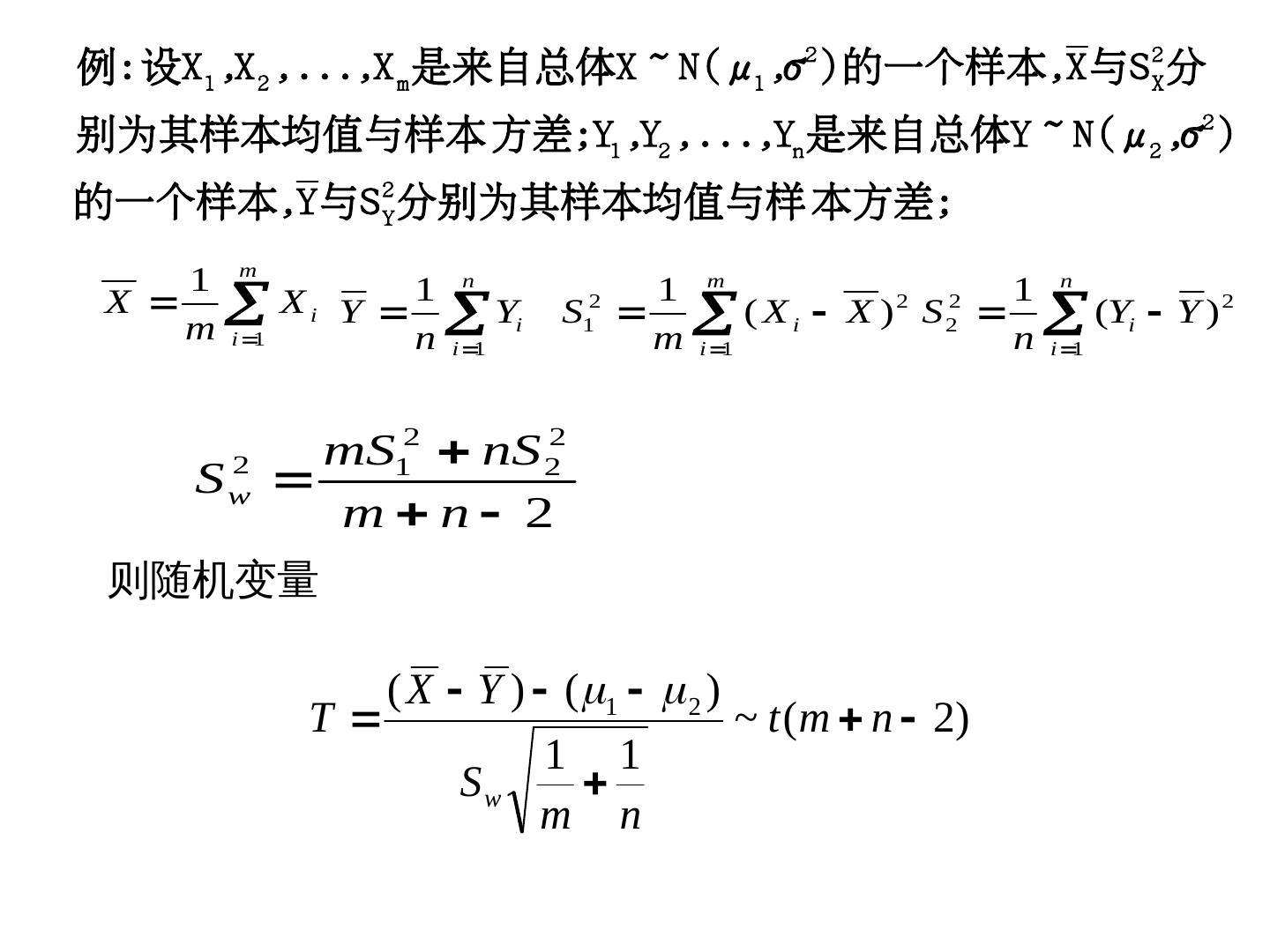 25 .例: 设XX 1 ,X 2 ,...,X m 是来自总体X ~ N(μμ1 ,σ2 )的一个样本 的,X 与S 2X 分 别为其样本 的均值与样本 的 方差;Y1 ,Y2 ,...,Yn是来自总体Y ~ N(μμ2 ,σ2 ) 的一个样本 的,Y 与S 2Y 分别为其样本 的均值与样 本 的方差; 1 m 1 n 1 m 1 n X Xi Y m i 1 n i 1 Yi S ( X i X ) S 2 (Yi Y ) 2 1 2 m i 1 2 2 n i 1 mS12 nS 22 S w2 mn 2 则随机变量 ( X Y ) ( 1 2 ) T ~ t ( m n 2) 1 1 Sw m n