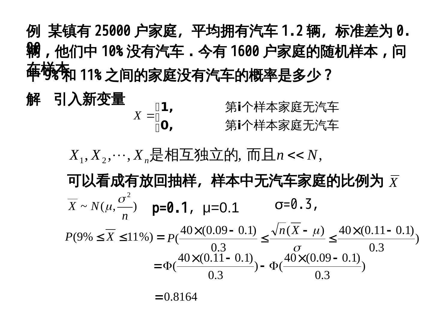 29 .例 某镇有 25000 户家庭,平均拥有汽车 1.2 辆,标准差为 0. 90 辆 , 他们中 10% 没有汽车 . 今有 1600 户家庭的随机样本 , 问 在样本 中 9% 和 11% 之间的家庭没有汽车的概率是多少 ? 解 引入新变量 1, 第i个样本家庭无汽车i个样本家庭无汽车个样本家庭无汽车 X 0, 第i个样本家庭无汽车i个样本家庭无汽车个样本家庭无汽车 X 1 , X 2 ,, X n 是相互独立的, 而且n N , 可以看成有放回抽样,样本中无汽车家庭的比例为 X 2 X ~ N ( , ) p=0.1, μ=0.1 σ=0.3, n 40 (0.09 0.1) n ( X ) 40 (0.11 0.1) P(9% X 11 %) P( ) 0.3 0.3 40 (0.11 0.1) 40 (0.09 0.1) ( ) ( ) 0.3 0.3 0.8164